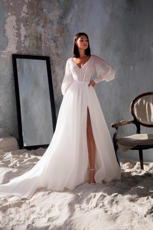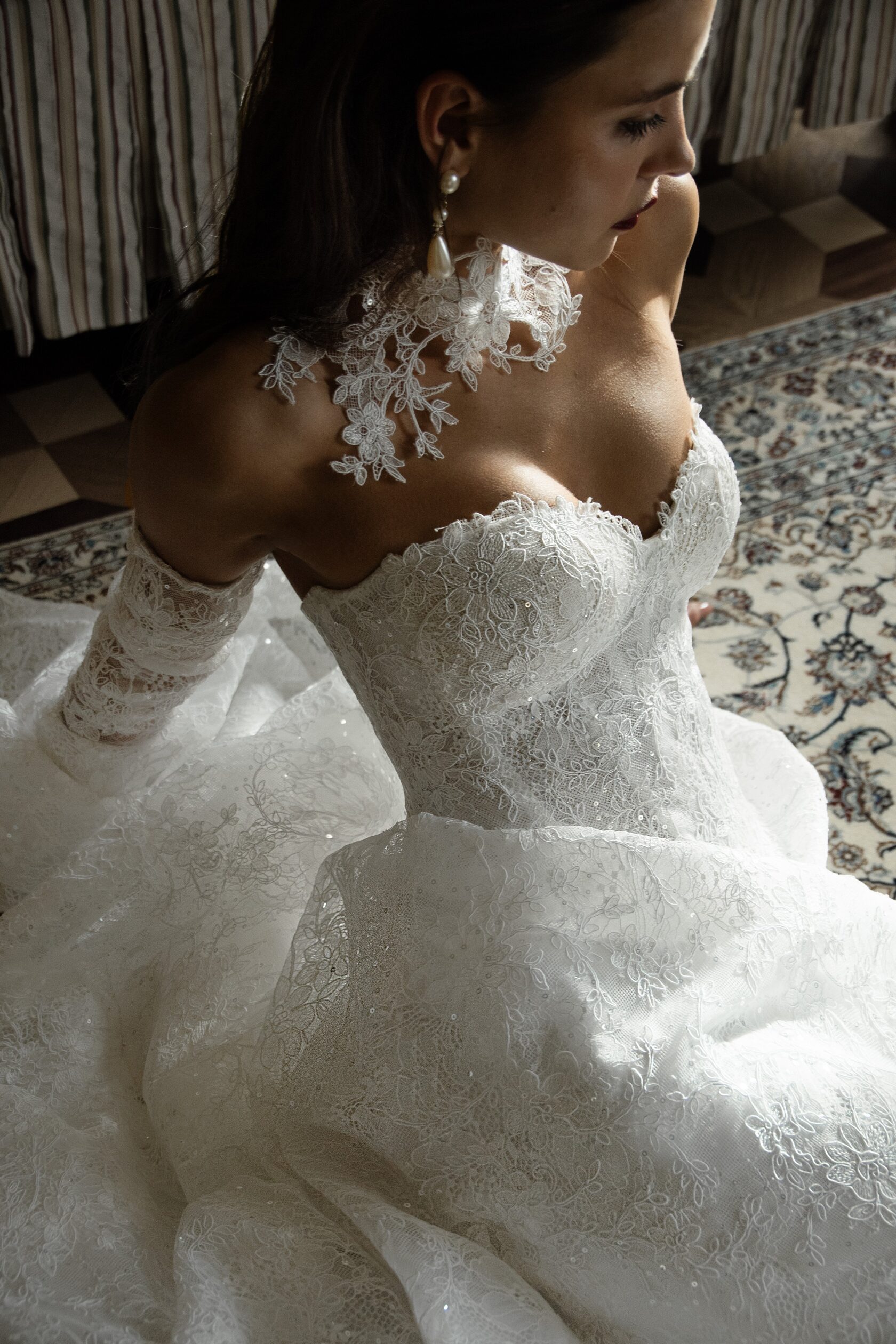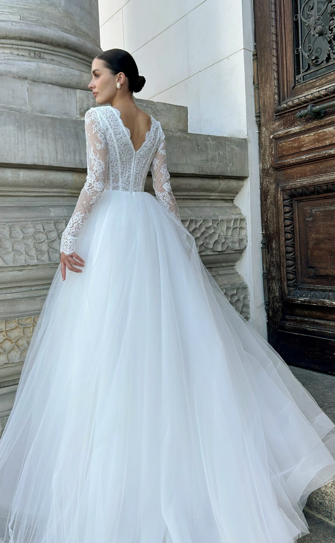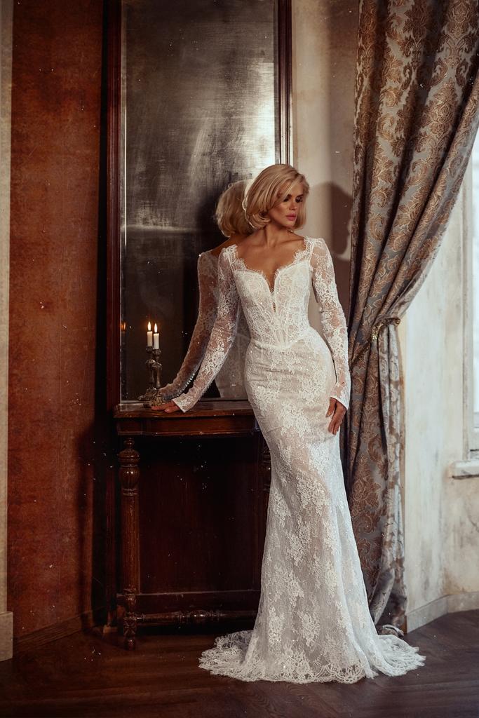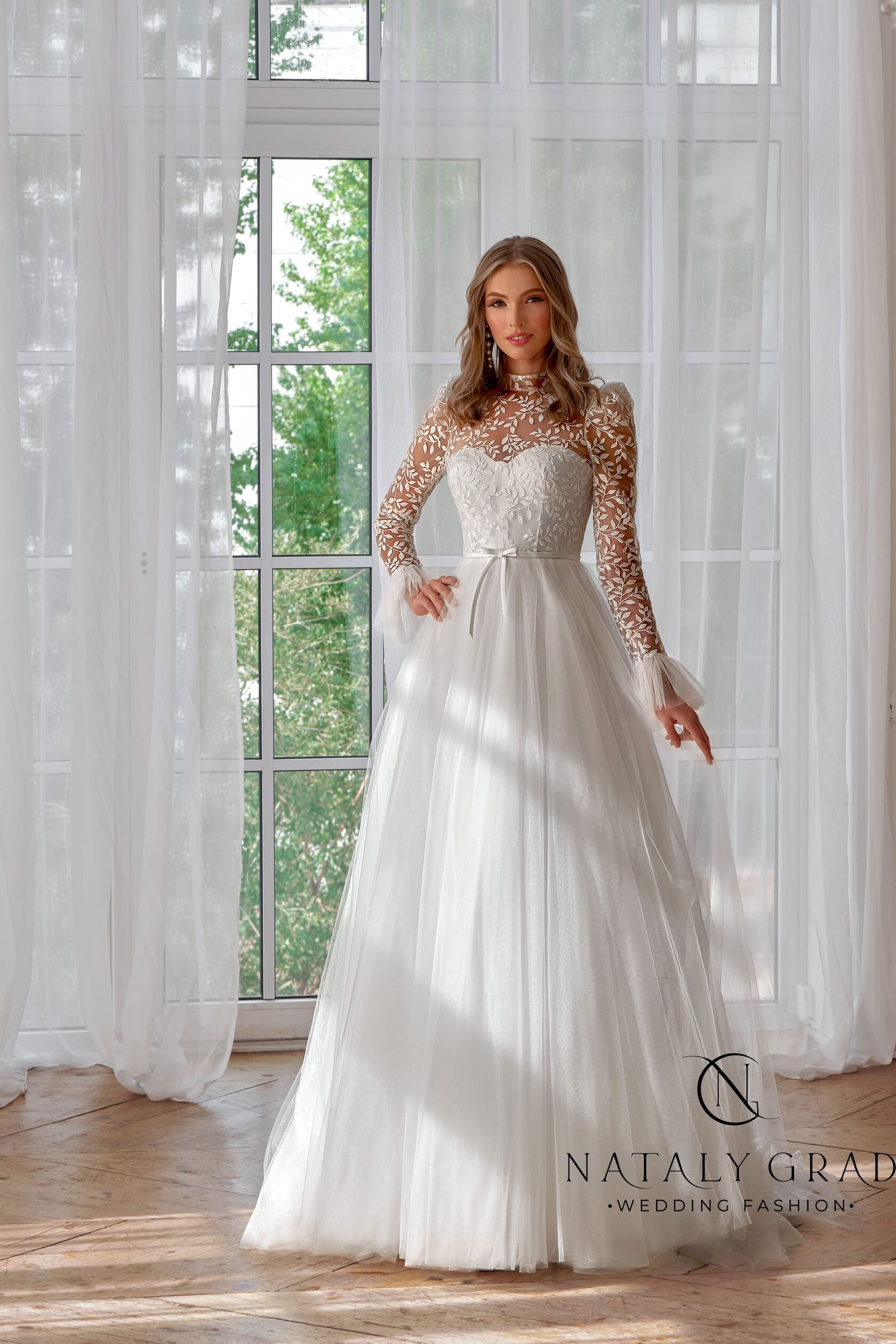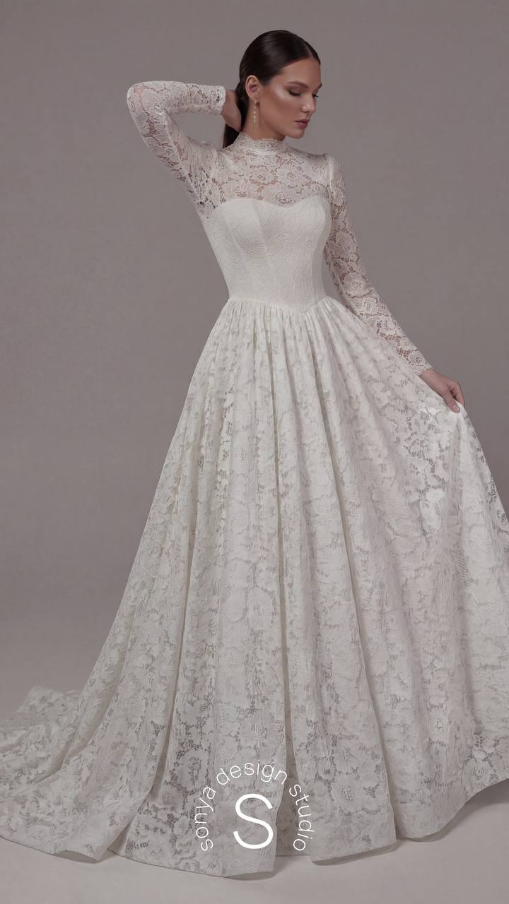 Роскошное подвенечное платье с корсетом и рукавами. Кружевной верх с V-образным вырезом и воротником-стойкой делает образ невероятно элегантным. Длинная фатиновая юбка со шлейфом для максимальной торжественности.