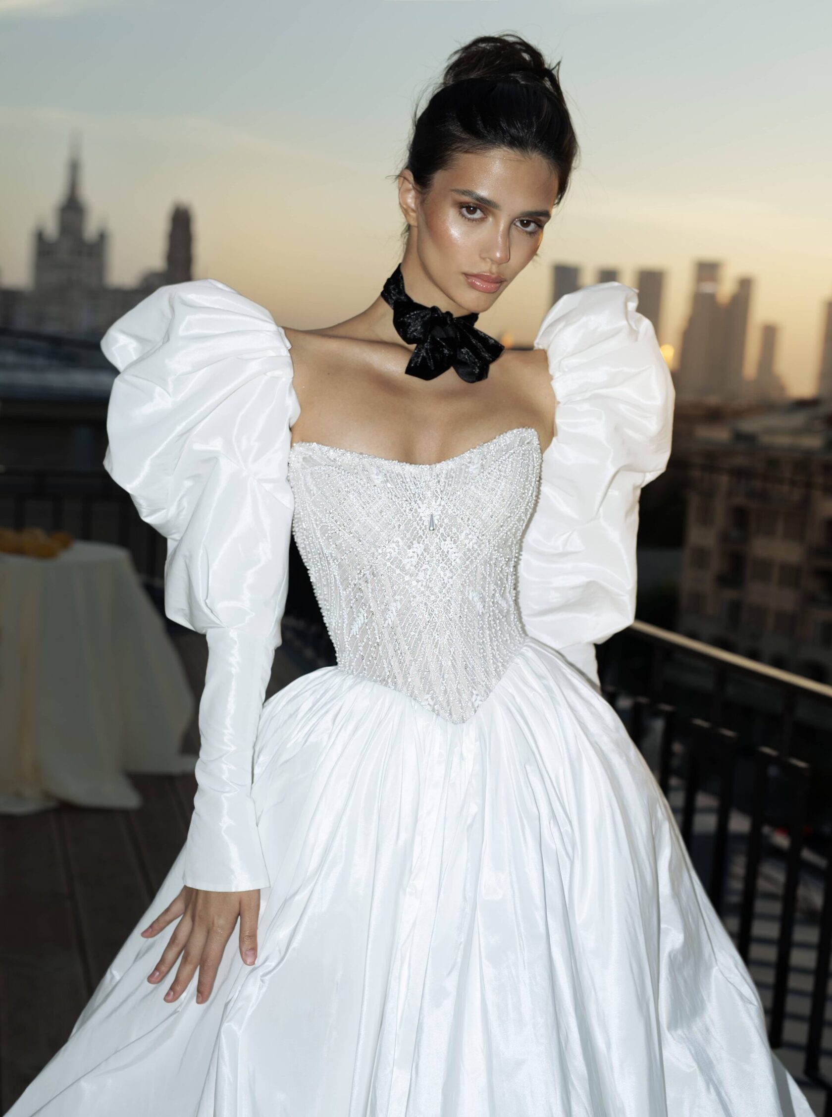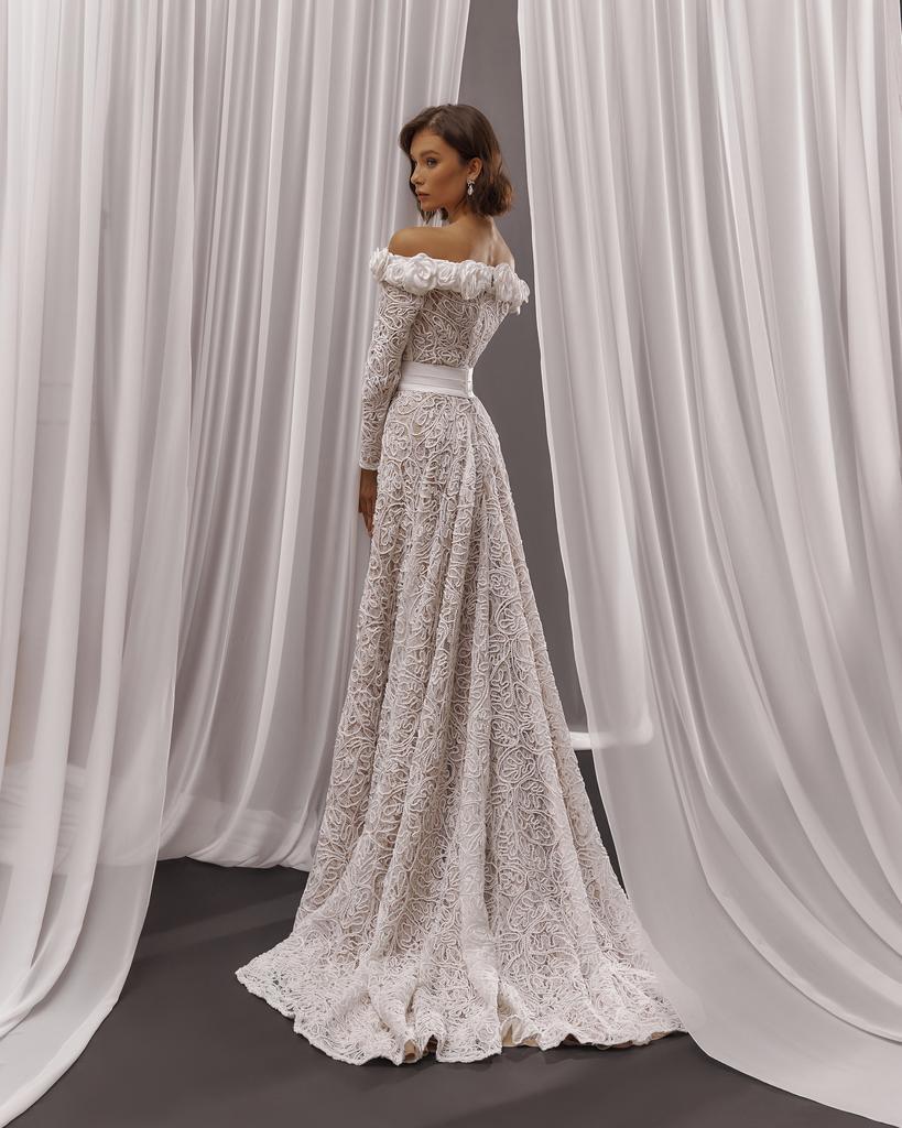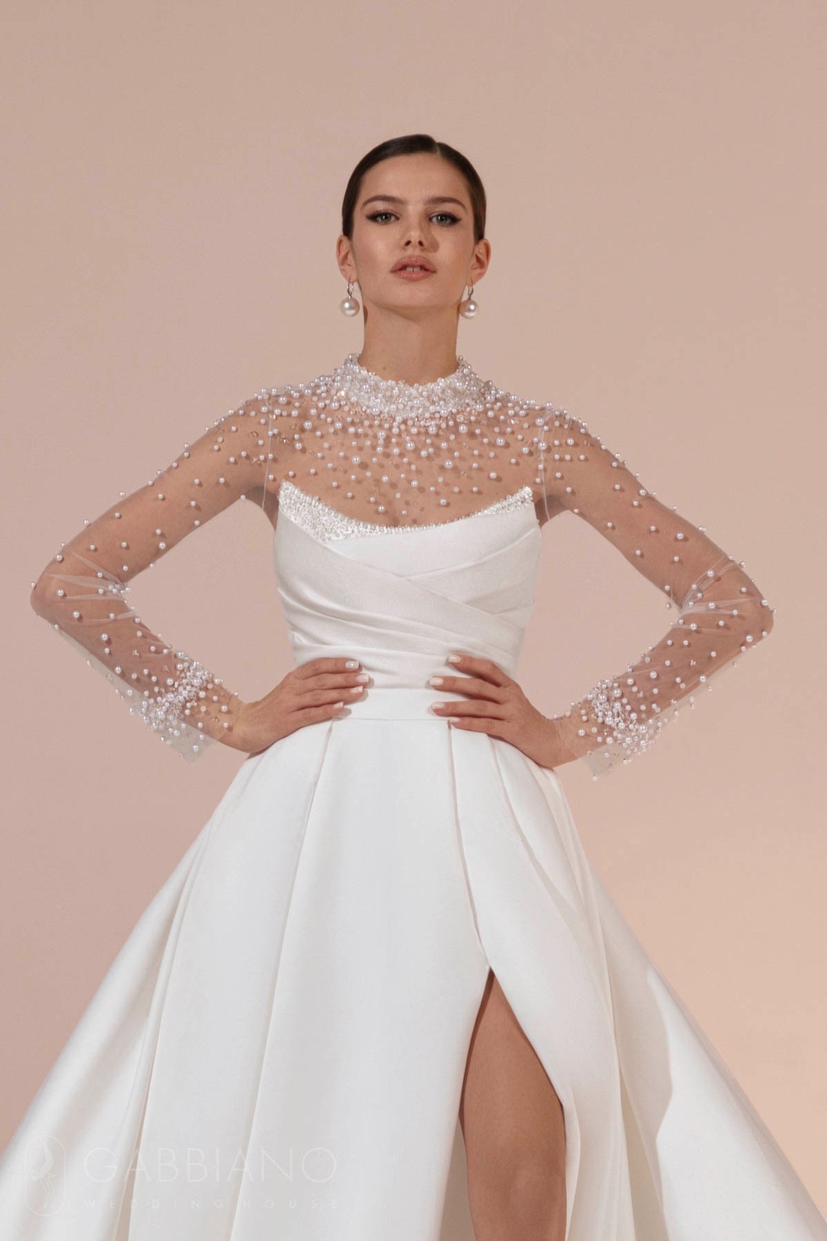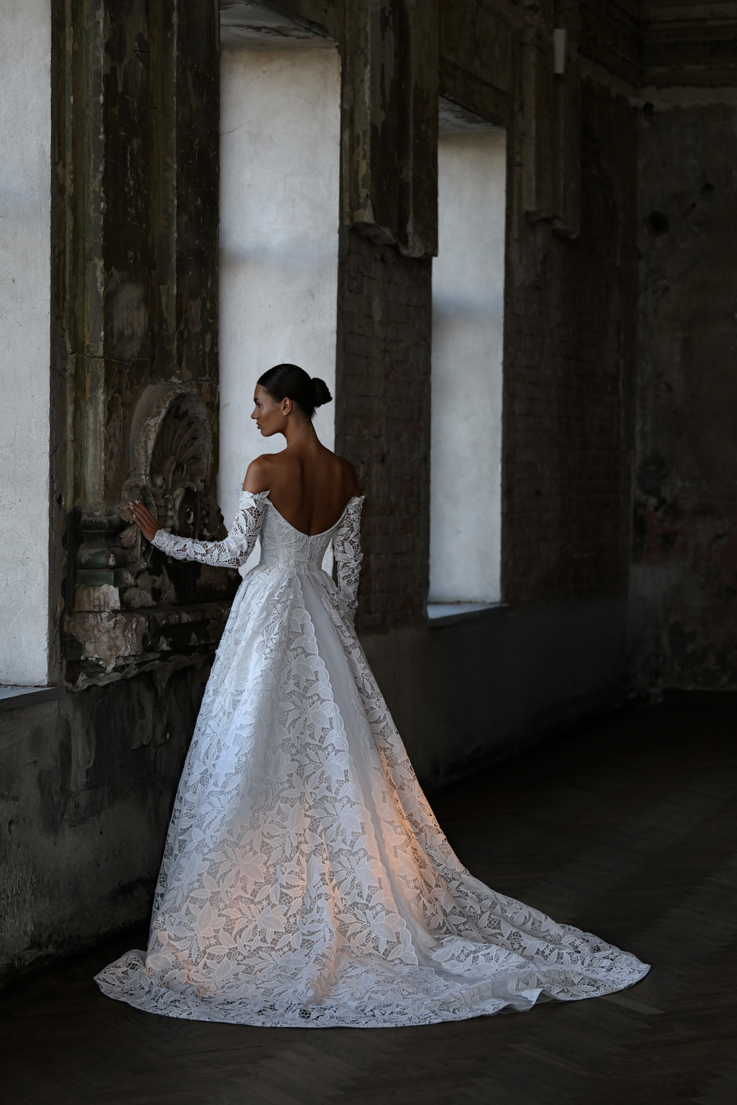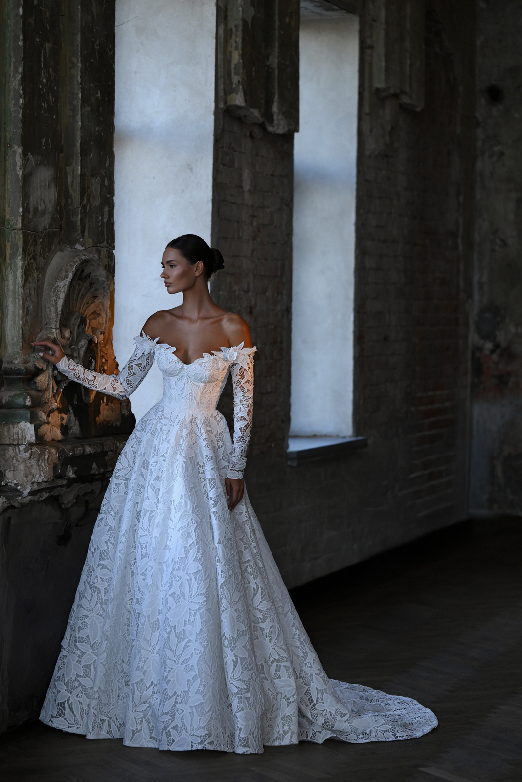 Роскошное подвенечное платье с корсетом и рукавами. Кружевной верх с V-образным вырезом и воротником-стойкой делает образ невероятно элегантным. Длинная фатиновая юбка со шлейфом для максимальной торжественности.