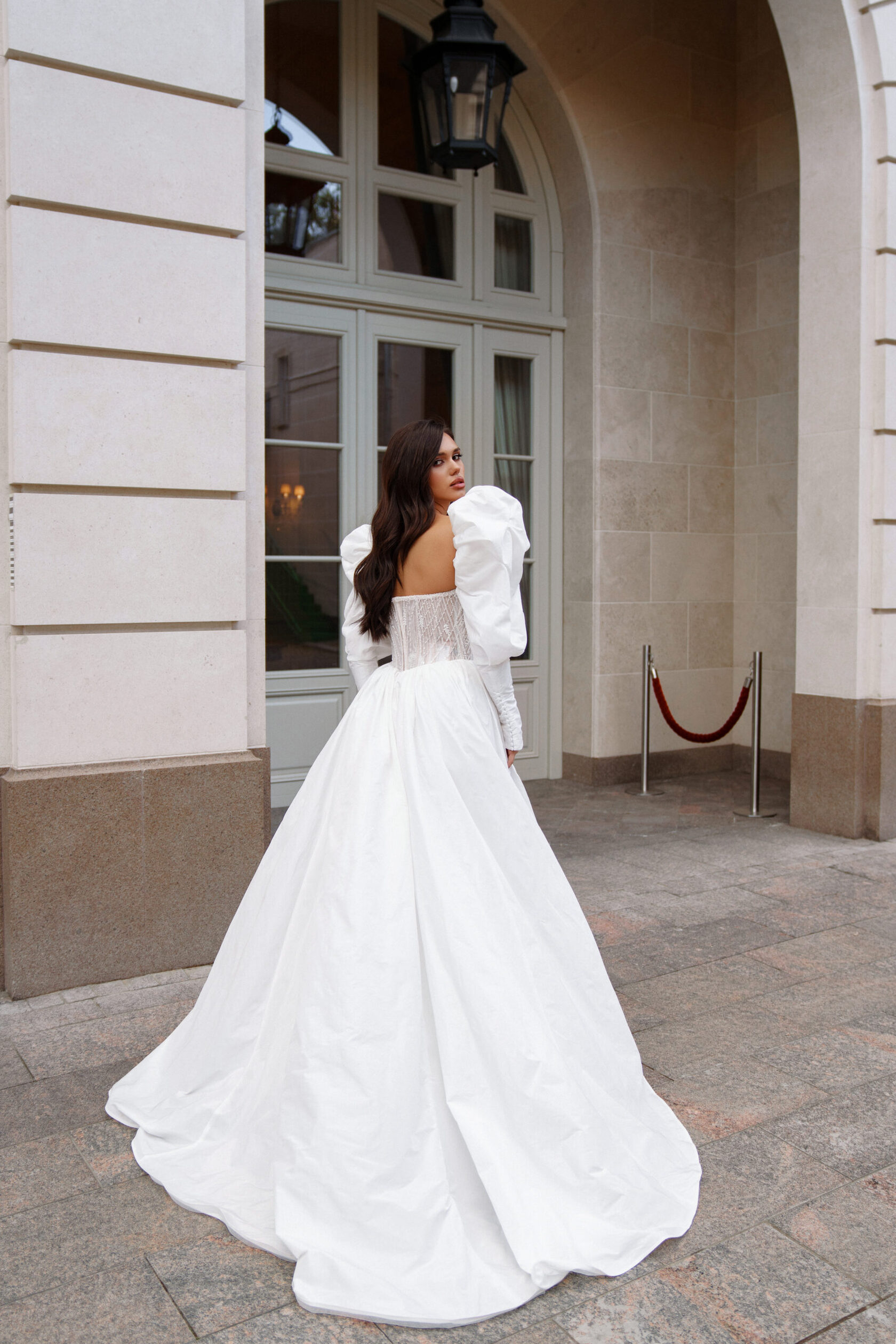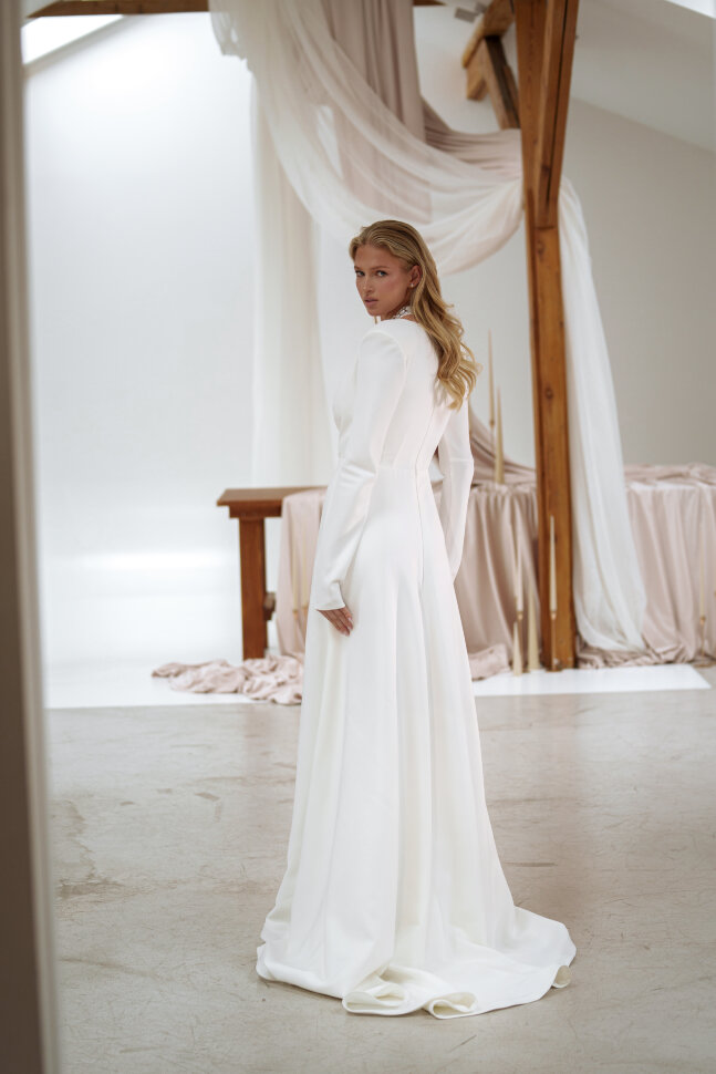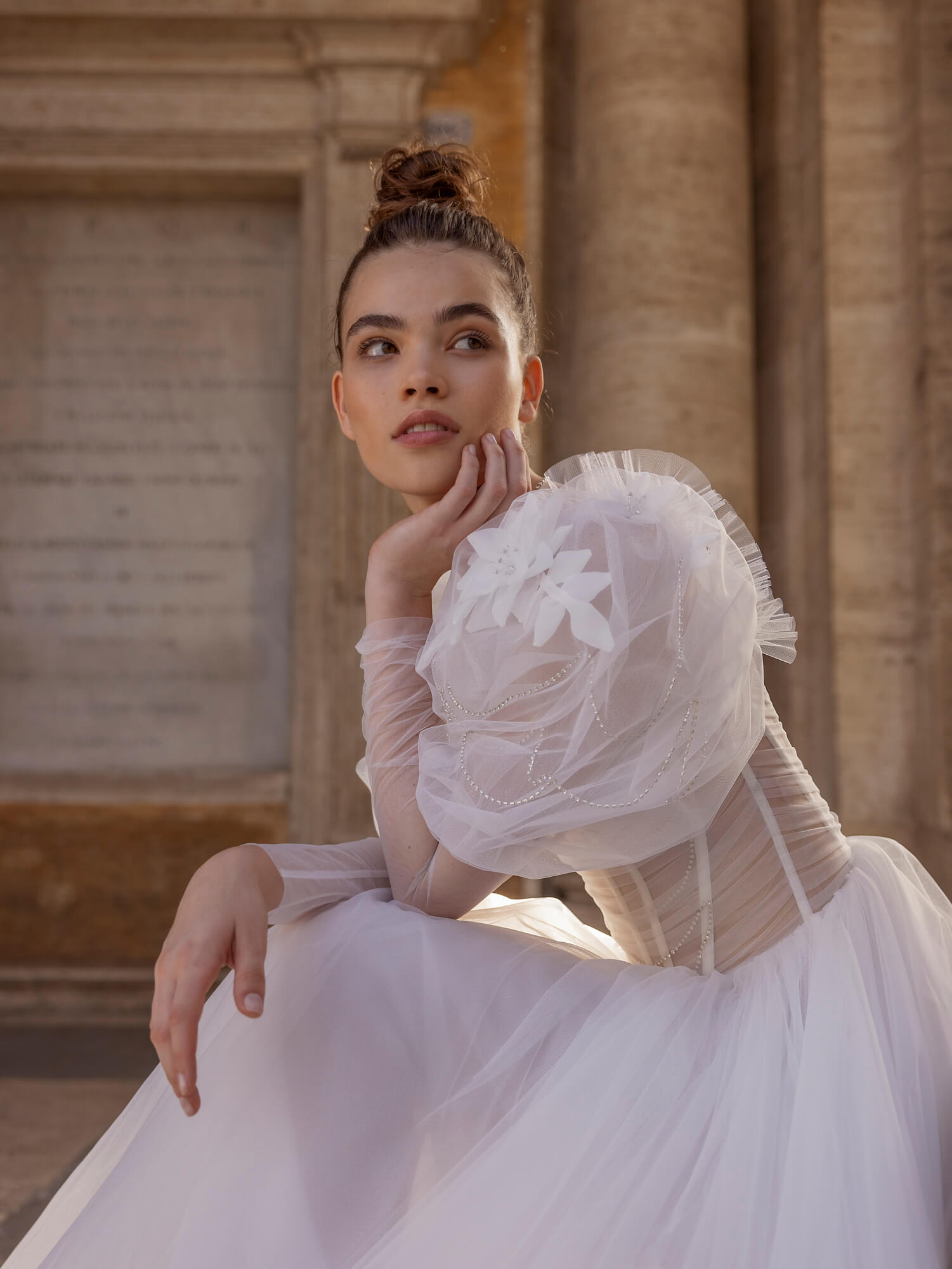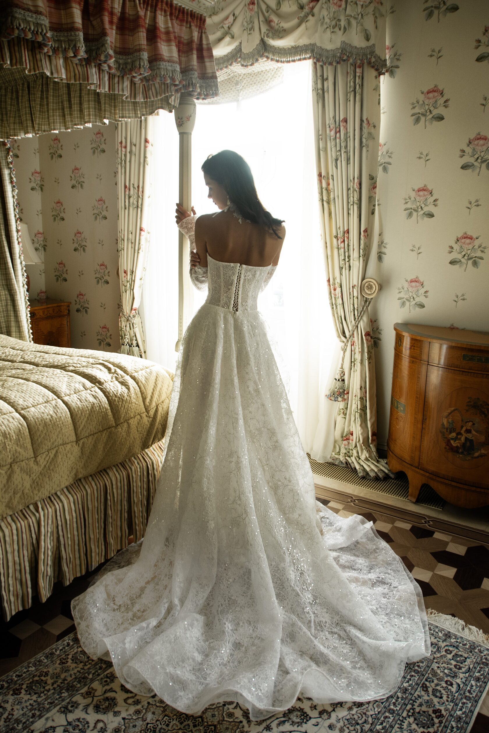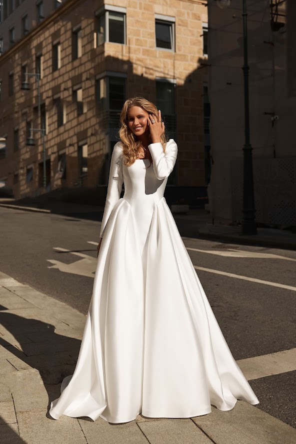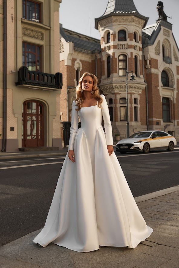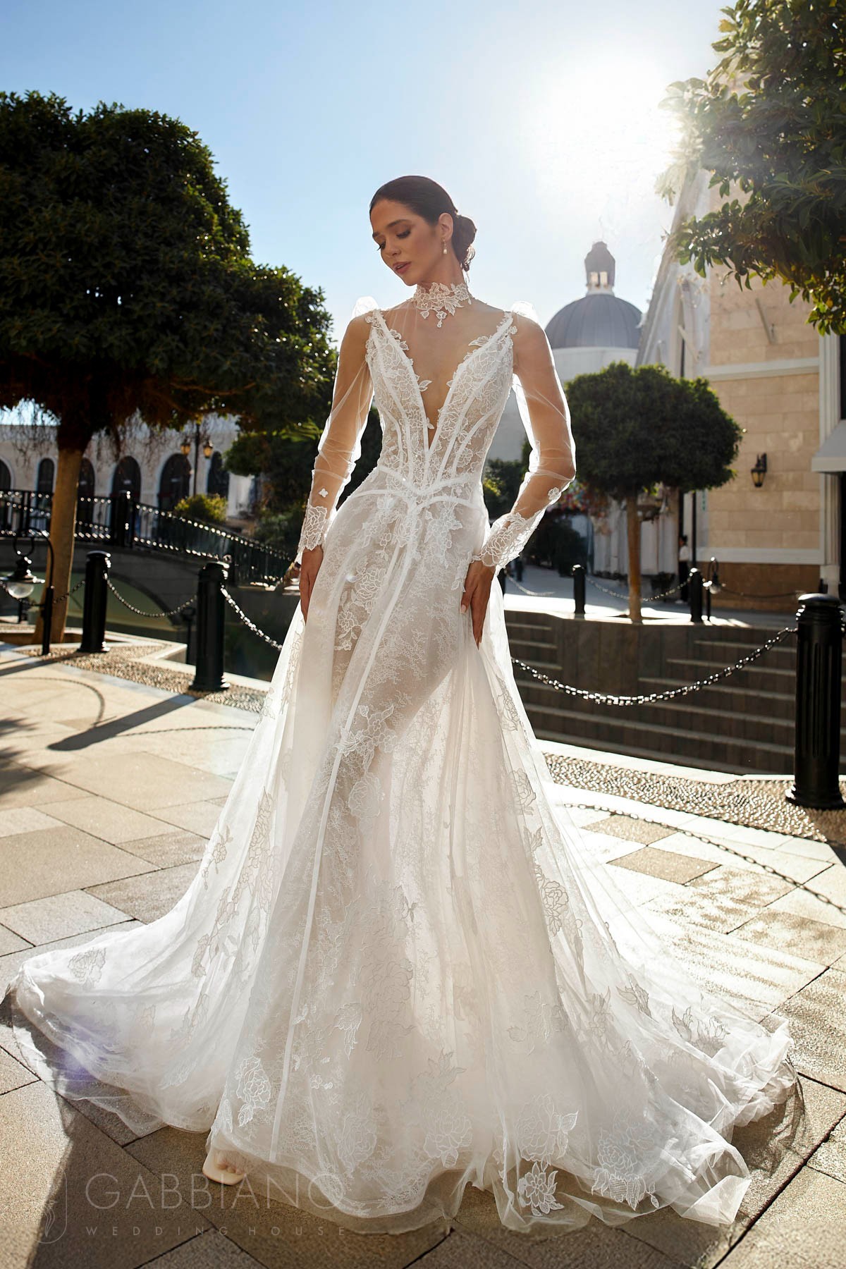 Роскошное подвенечное платье с корсетом и рукавами. Кружевной верх с V-образным вырезом и воротником-стойкой делает образ невероятно элегантным. Длинная фатиновая юбка со шлейфом для максимальной торжественности.