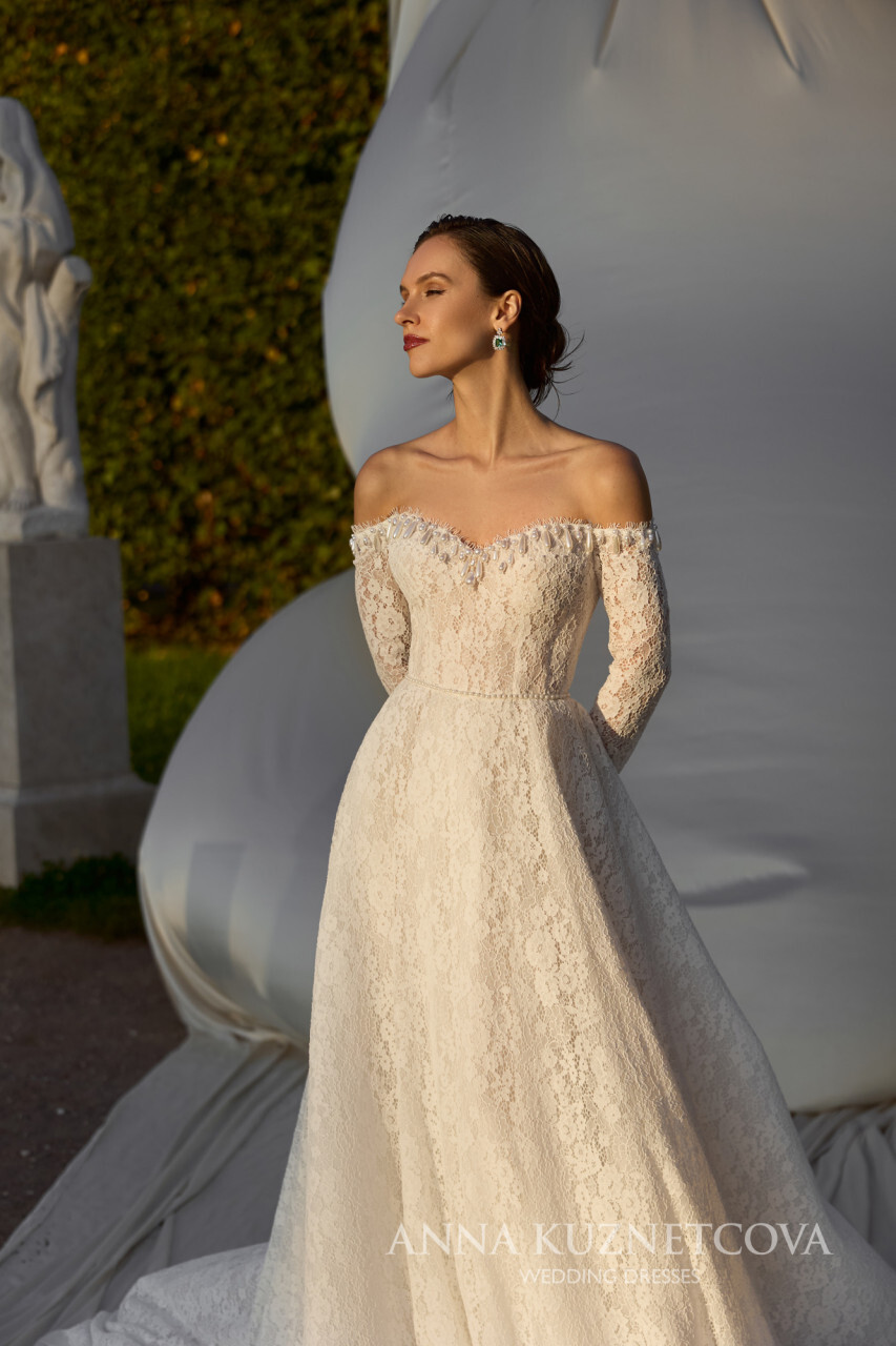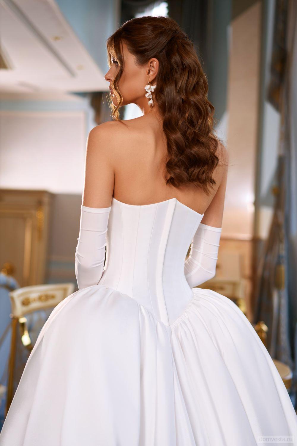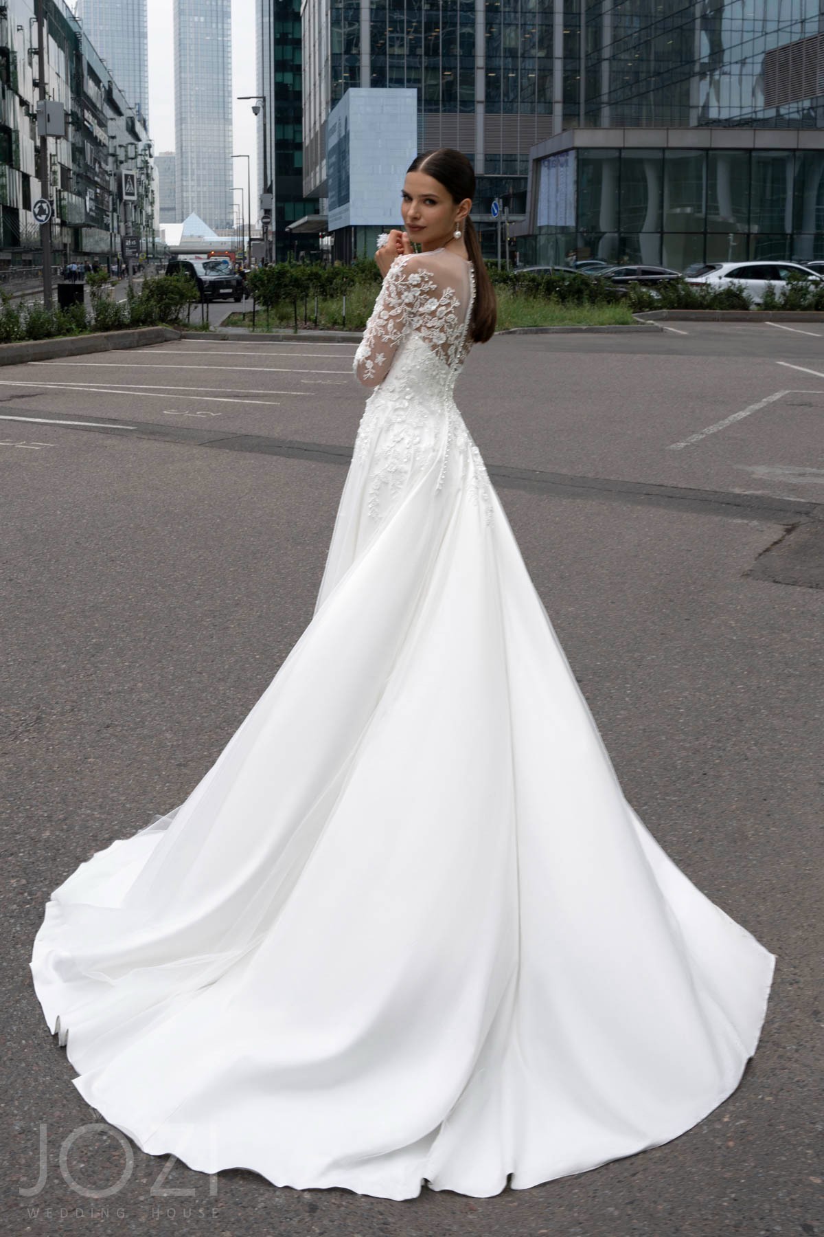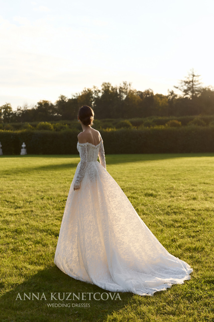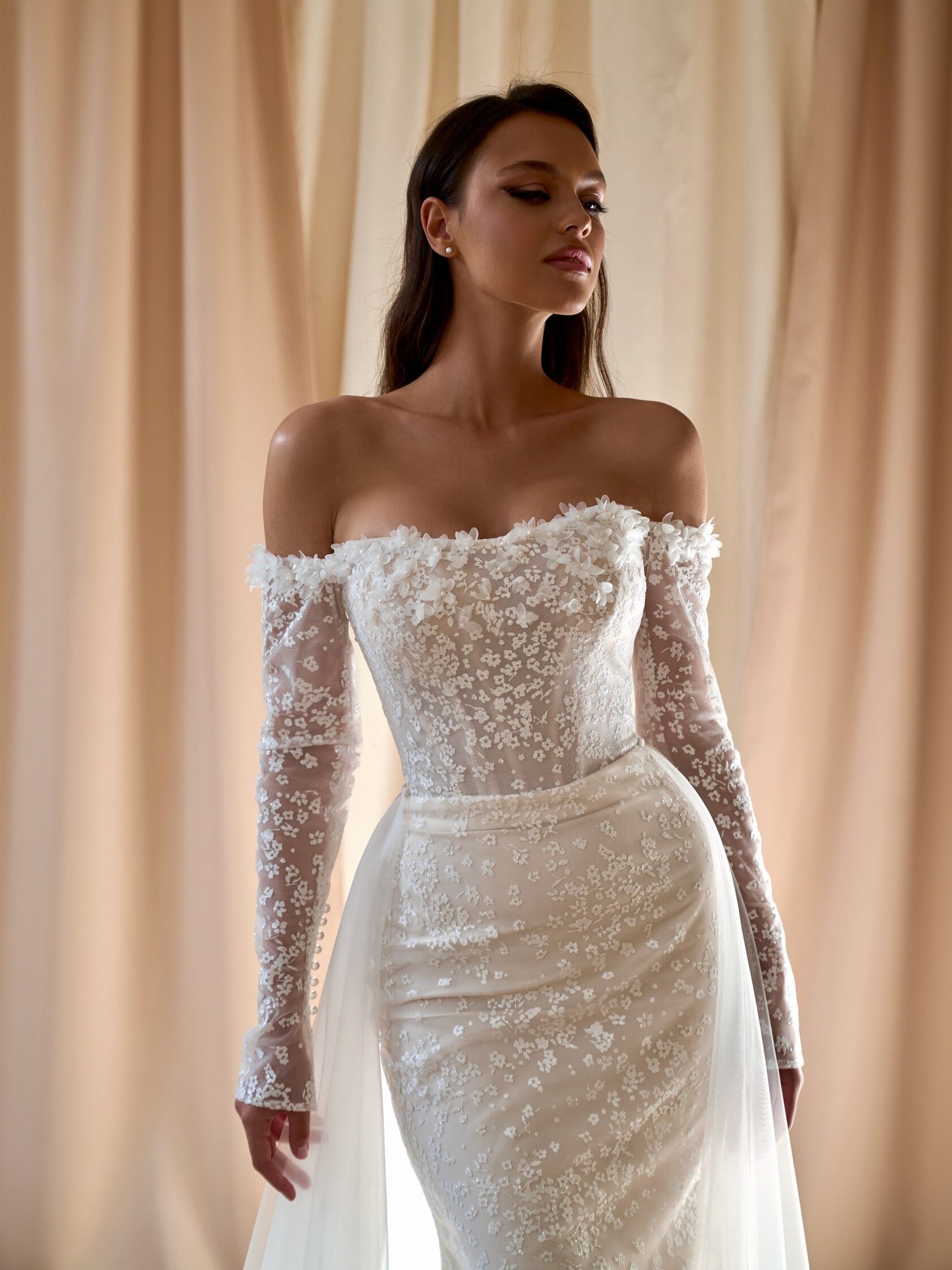 Роскошное подвенечное платье с корсетом и рукавами. Кружевной верх с V-образным вырезом и воротником-стойкой делает образ невероятно элегантным. Длинная фатиновая юбка со шлейфом для максимальной торжественности.