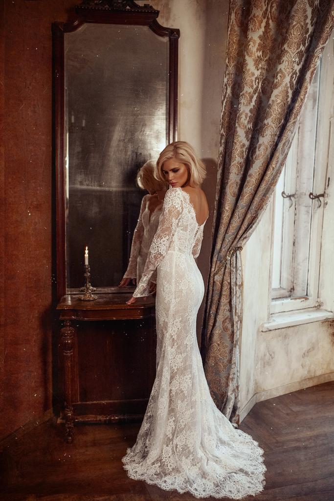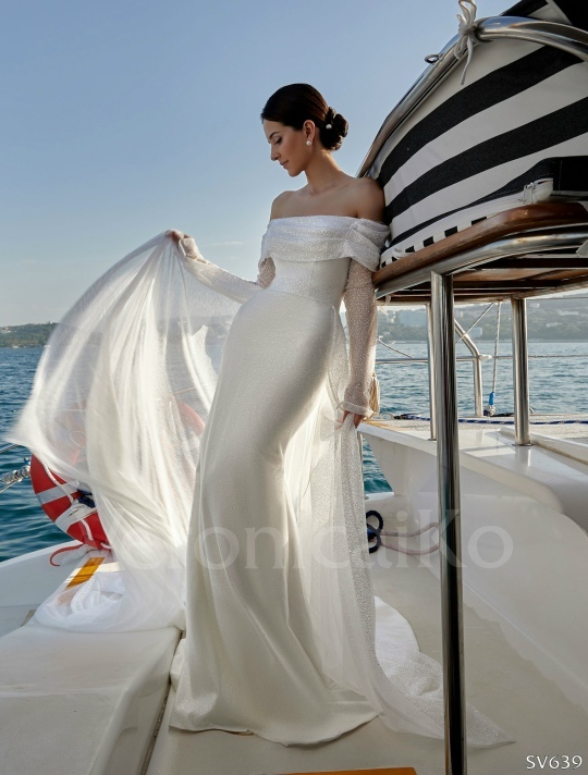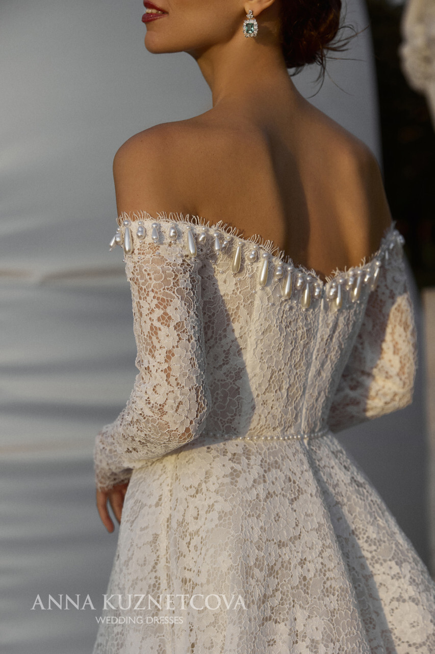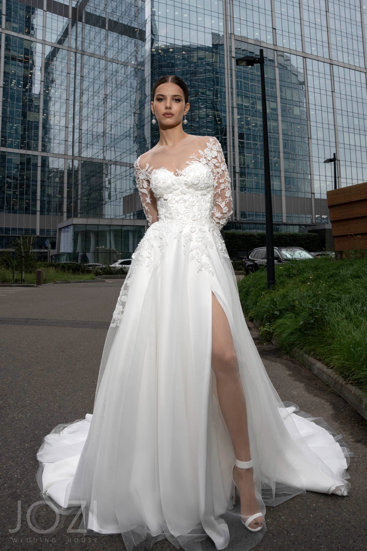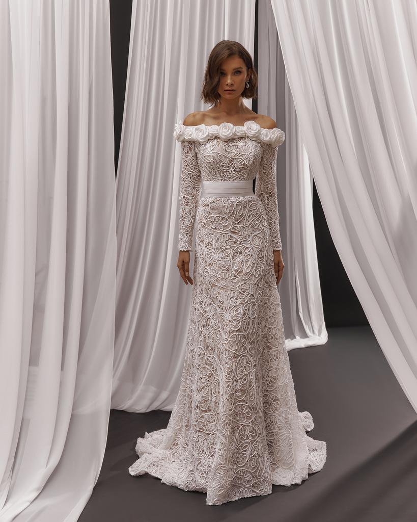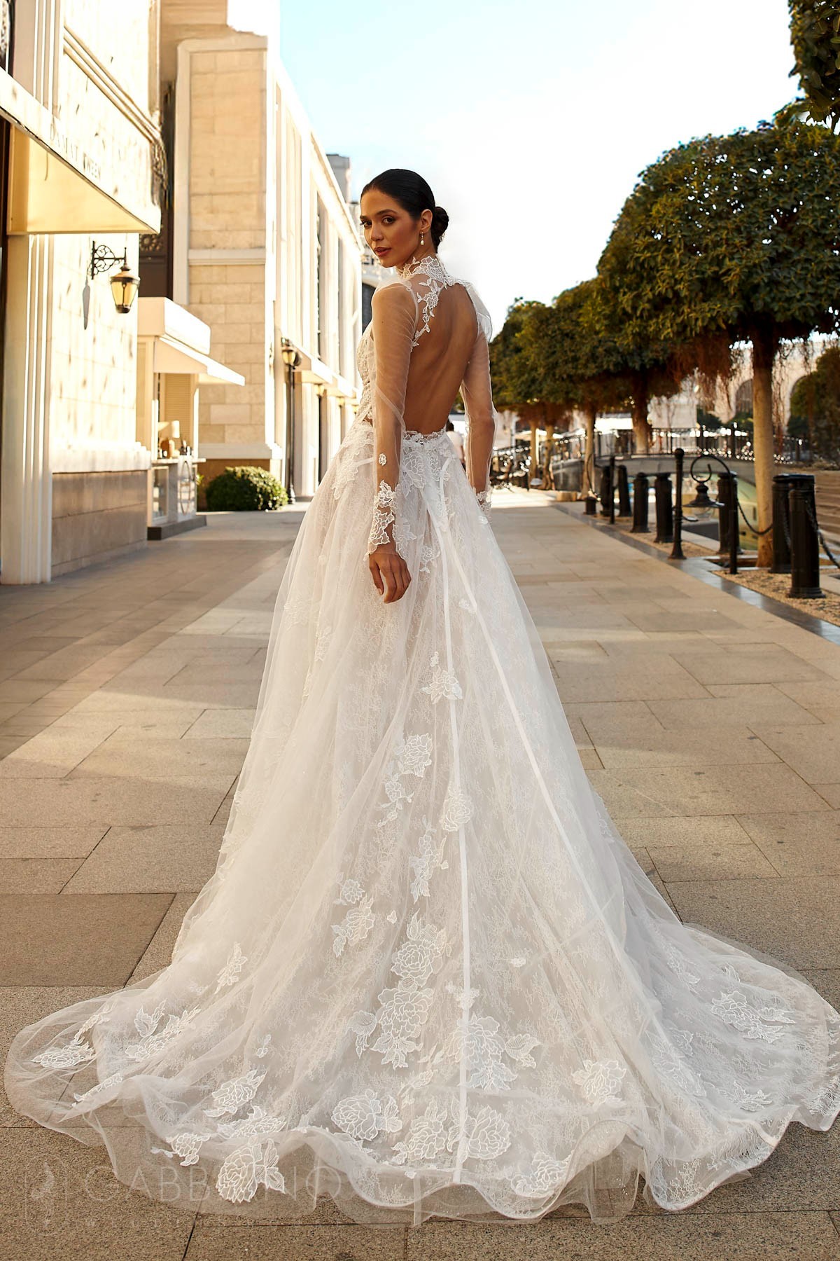 Роскошное подвенечное платье с корсетом и рукавами. Кружевной верх с V-образным вырезом и воротником-стойкой делает образ невероятно элегантным. Длинная фатиновая юбка со шлейфом для максимальной торжественности.