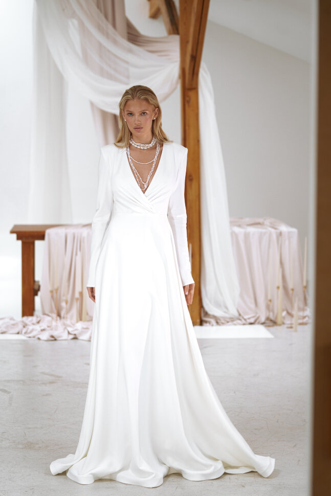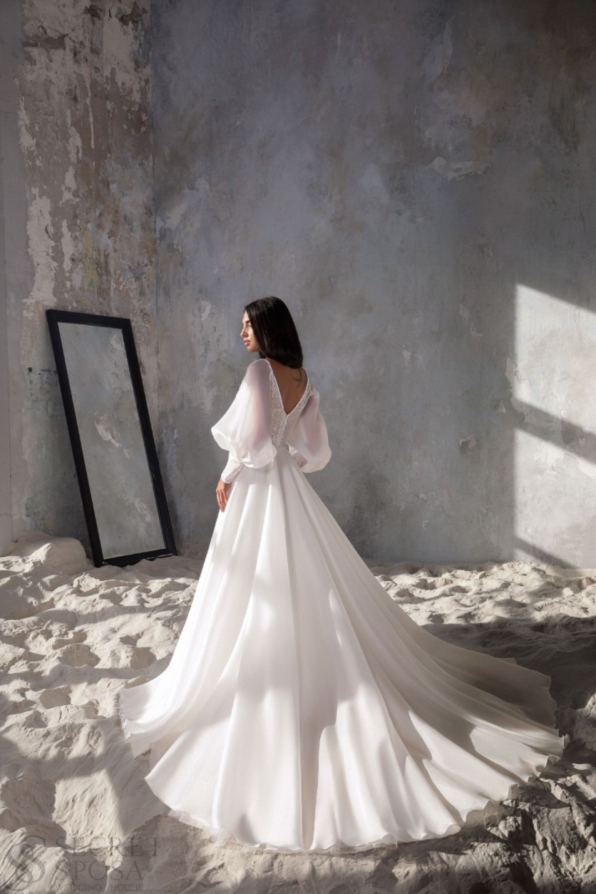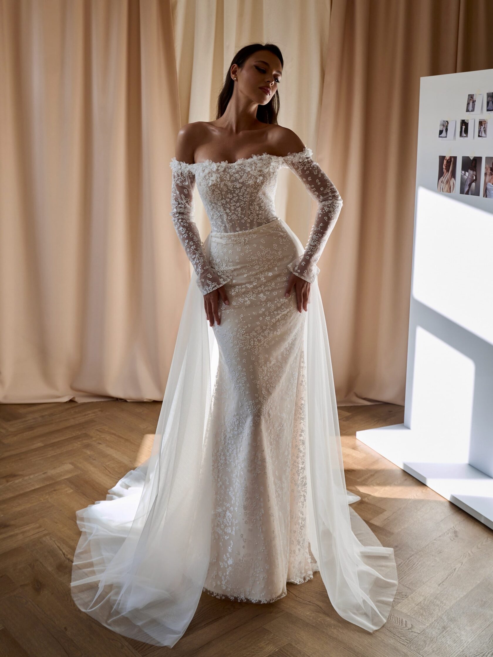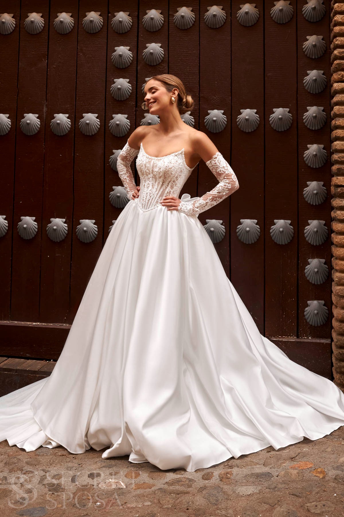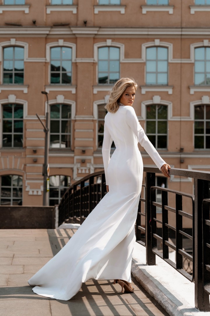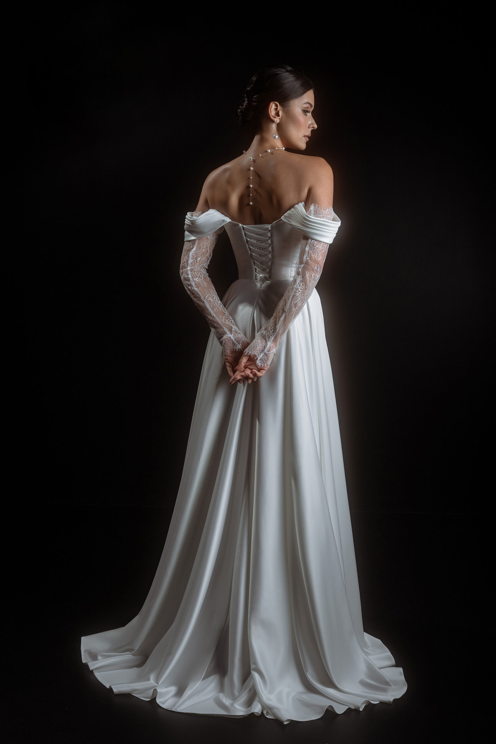 Роскошное подвенечное платье с корсетом и рукавами. Кружевной верх с V-образным вырезом и воротником-стойкой делает образ невероятно элегантным. Длинная фатиновая юбка со шлейфом для максимальной торжественности.