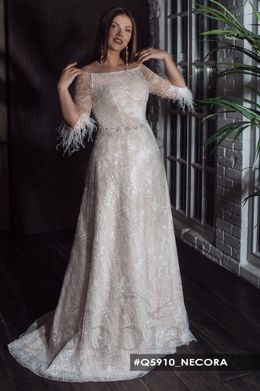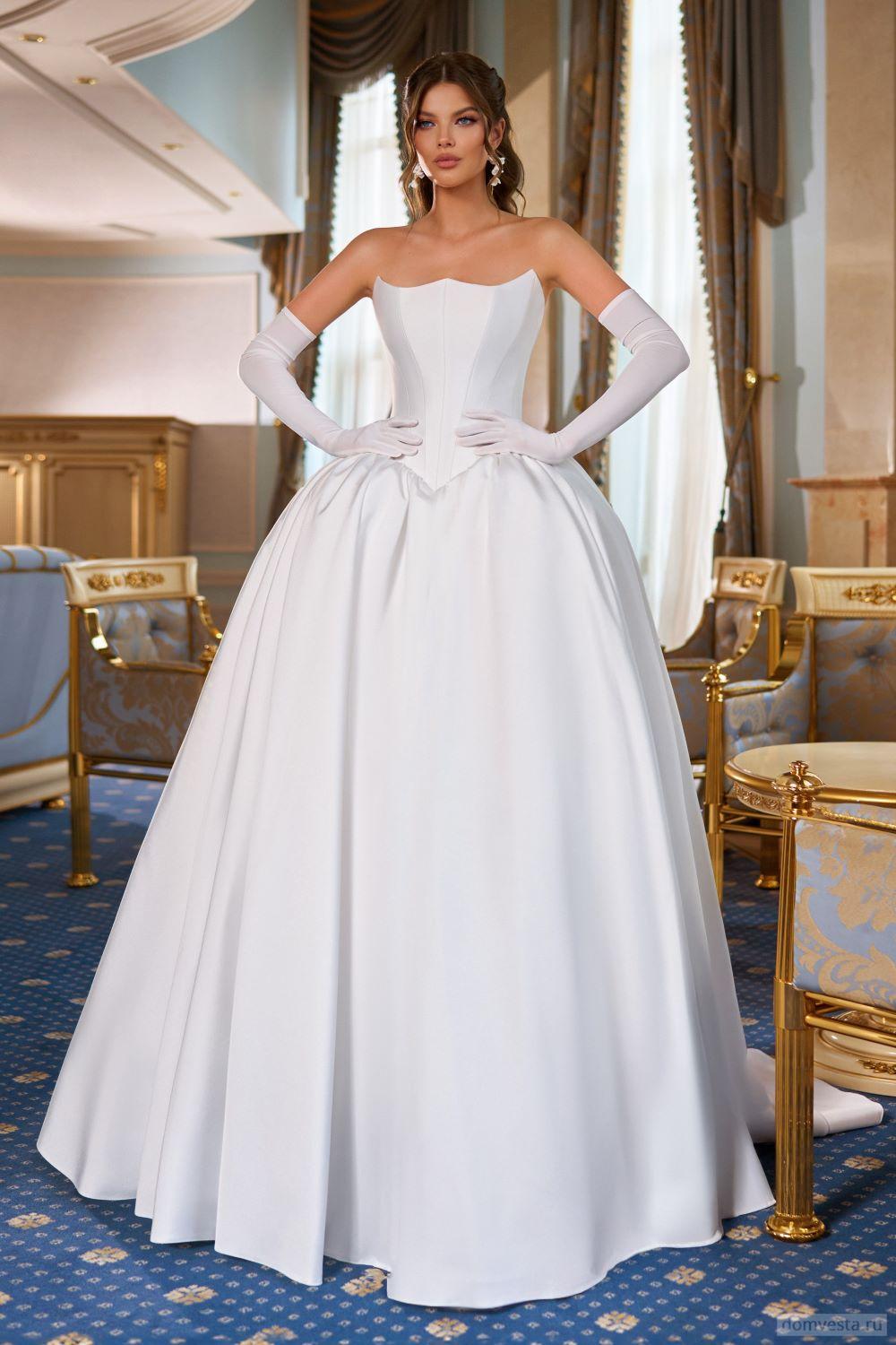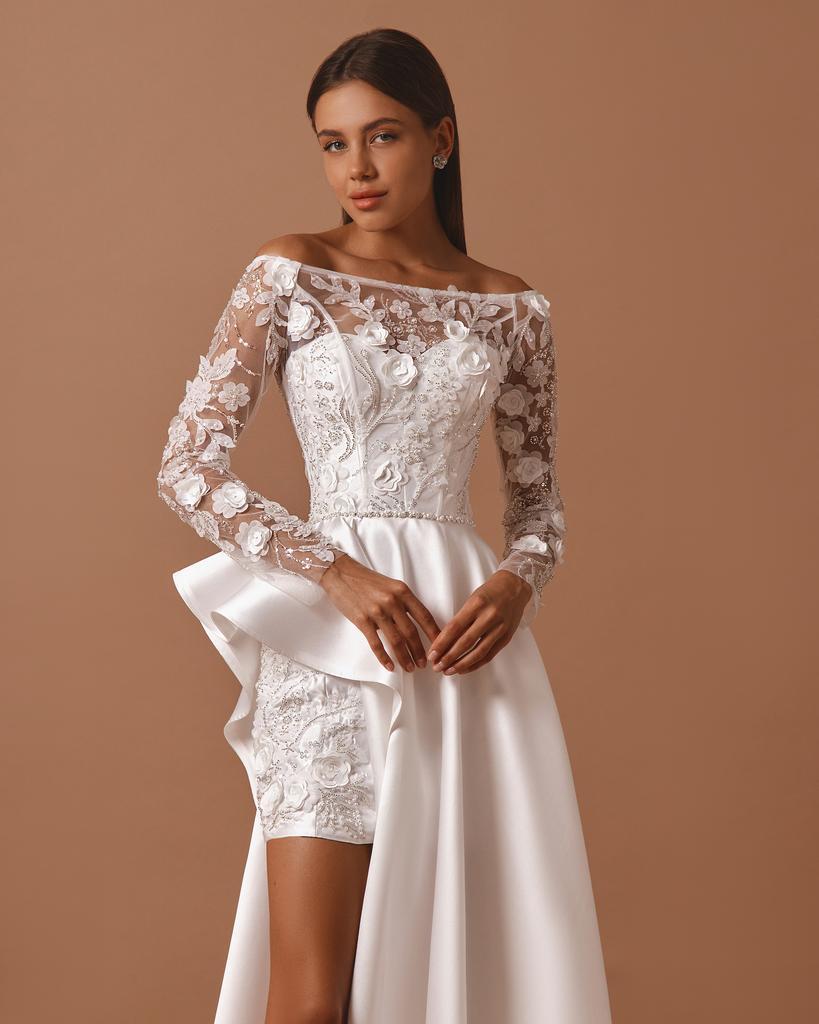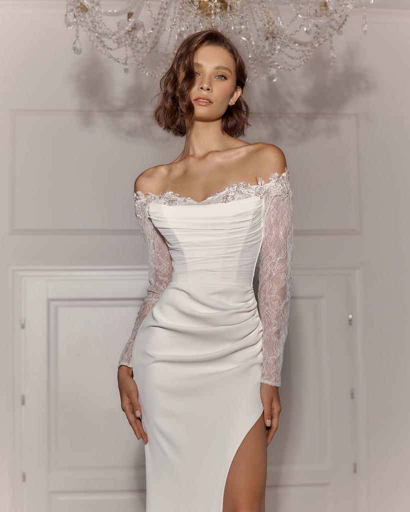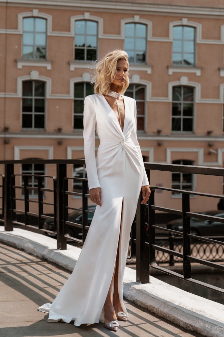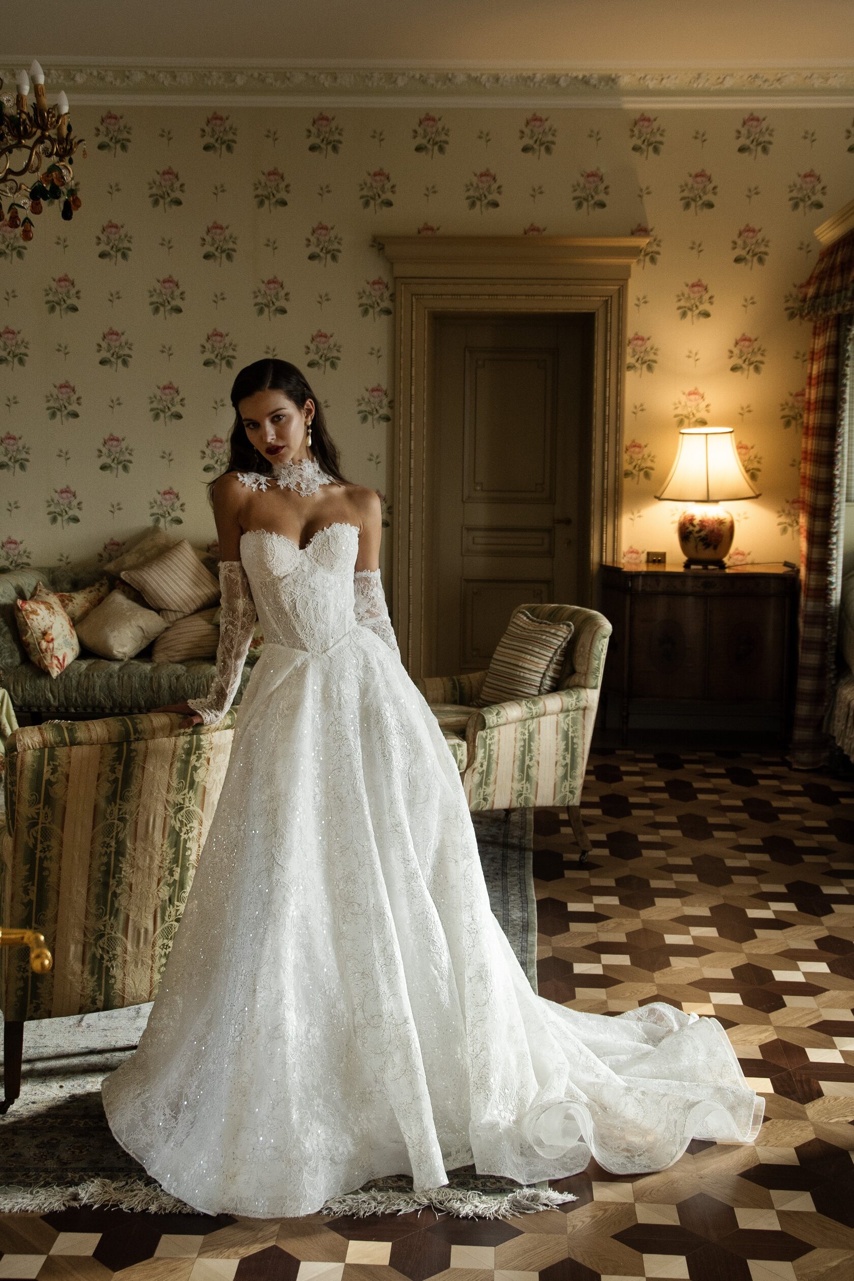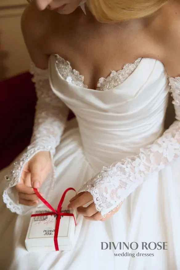 Роскошное подвенечное платье с корсетом и рукавами. Кружевной верх с V-образным вырезом и воротником-стойкой делает образ невероятно элегантным. Длинная фатиновая юбка со шлейфом для максимальной торжественности.
