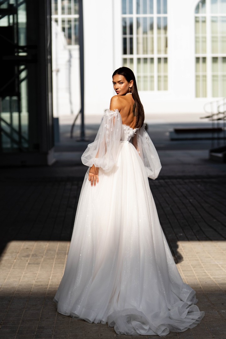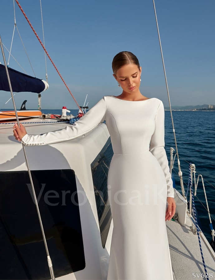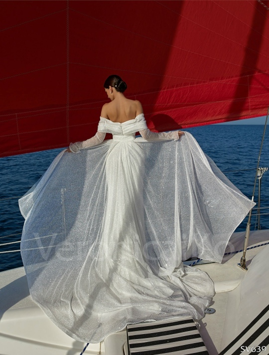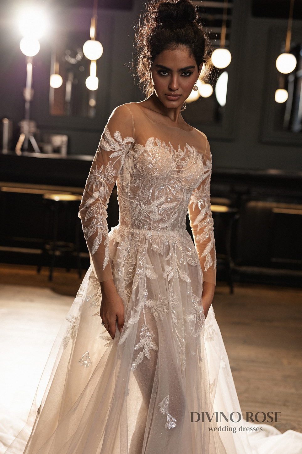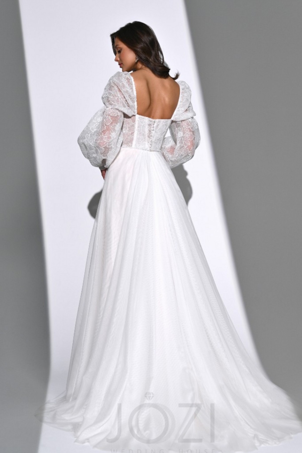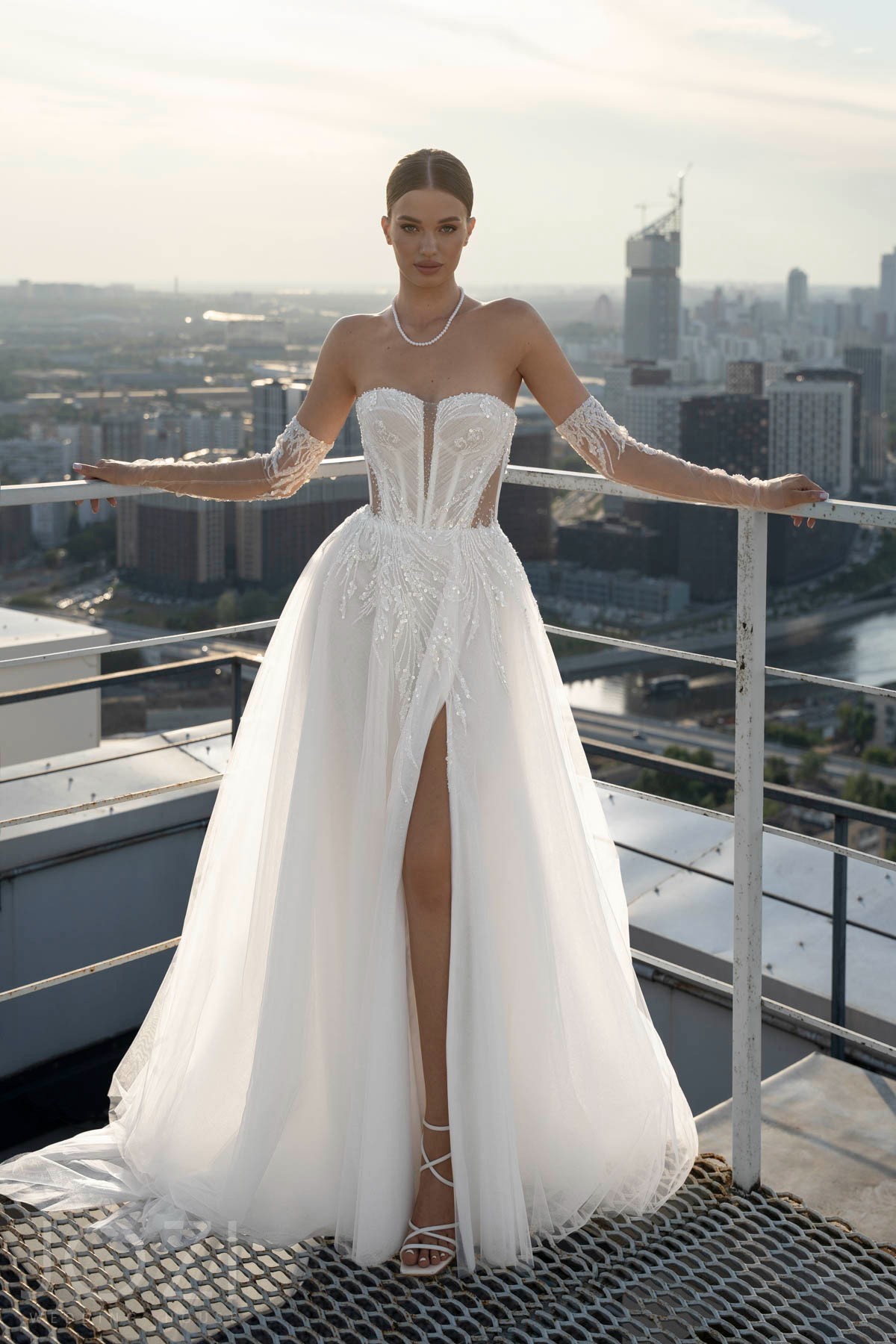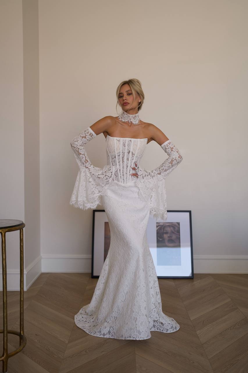 Роскошное подвенечное платье с корсетом и рукавами. Кружевной верх с V-образным вырезом и воротником-стойкой делает образ невероятно элегантным. Длинная фатиновая юбка со шлейфом для максимальной торжественности.