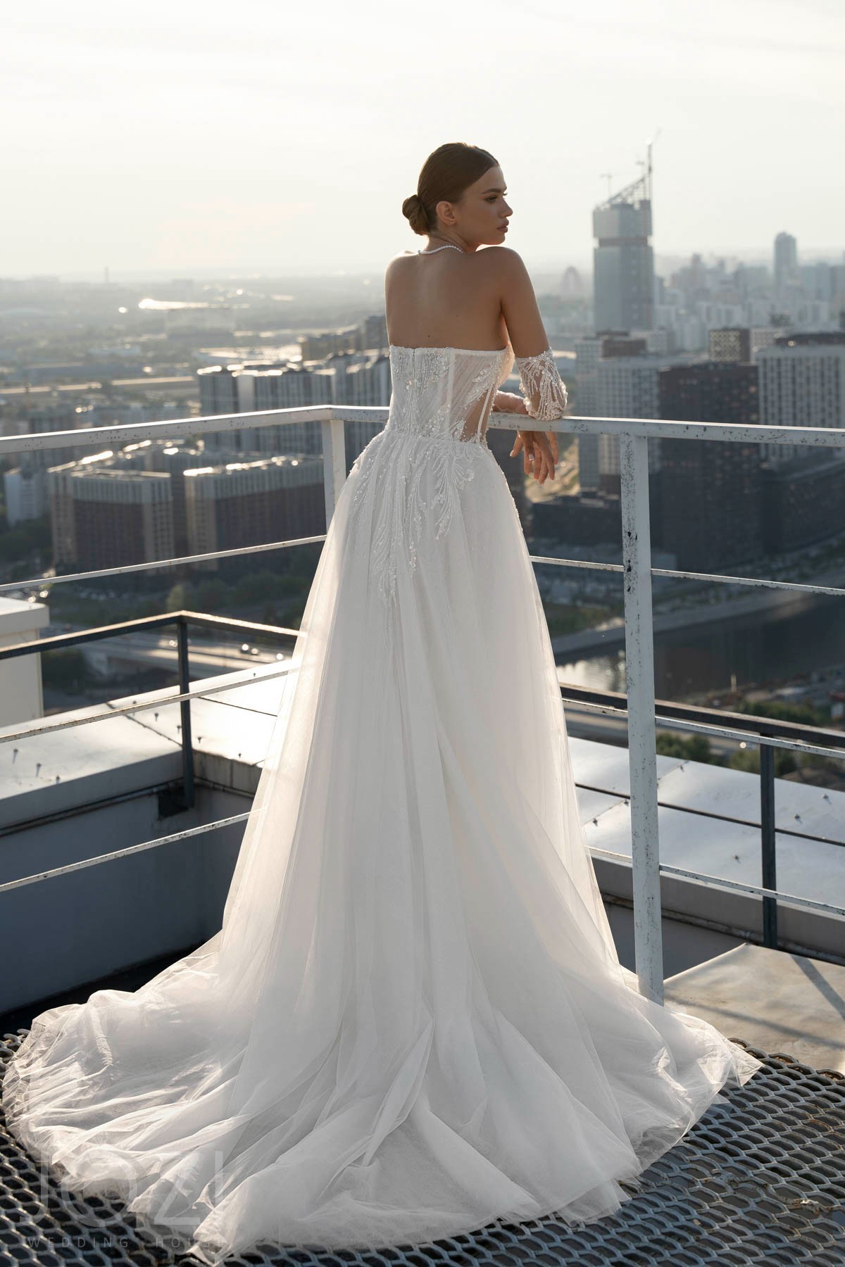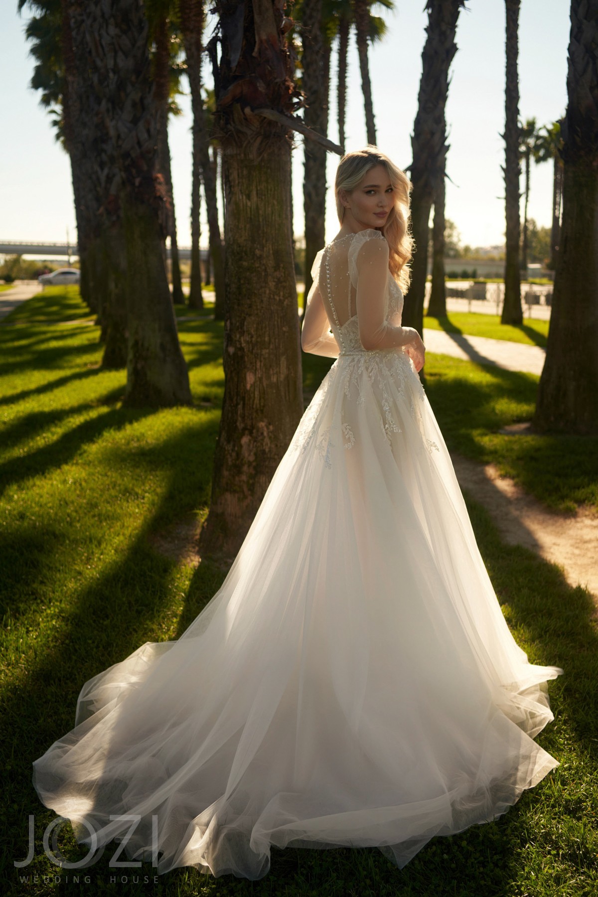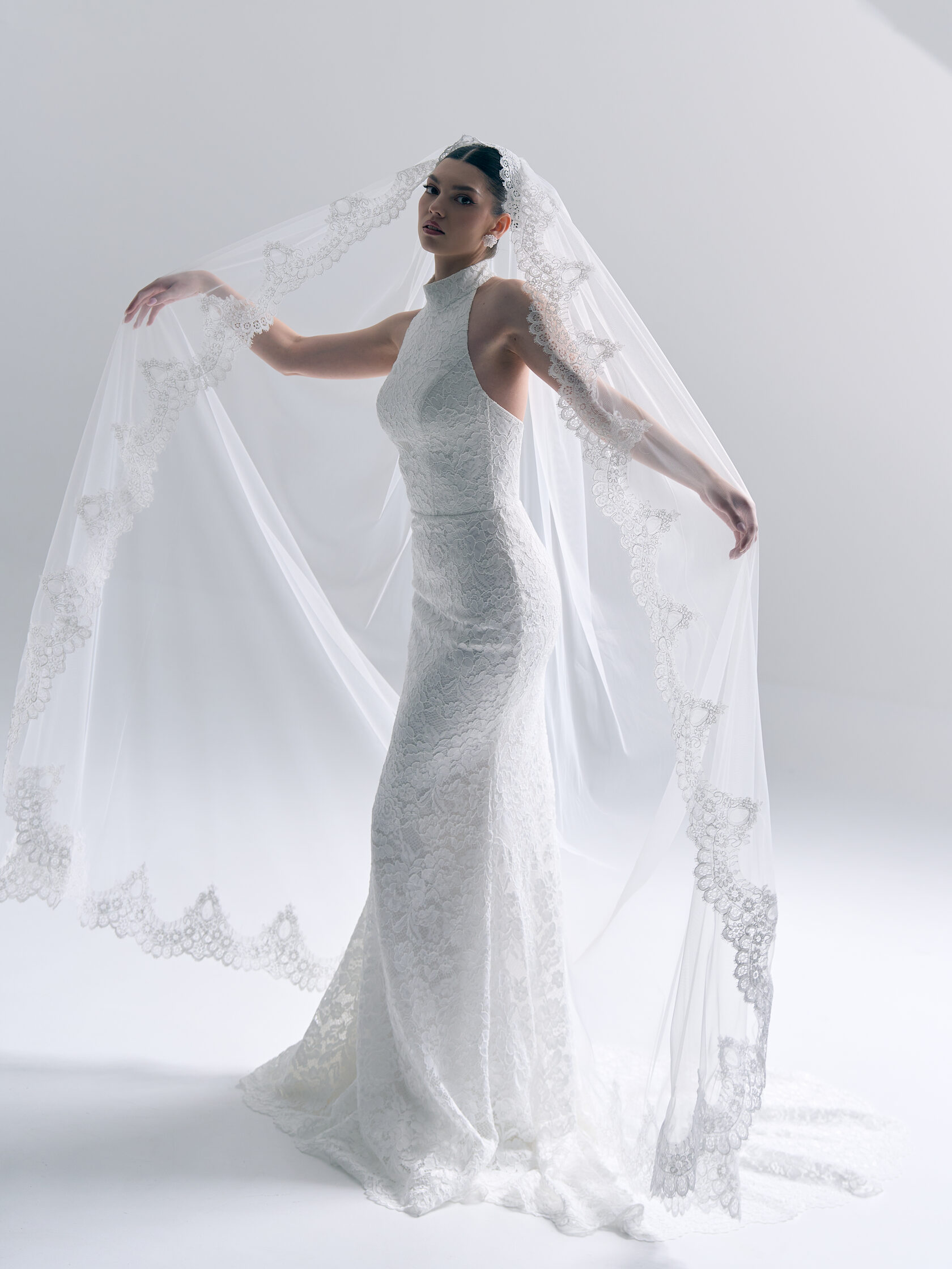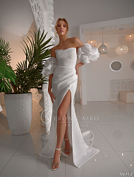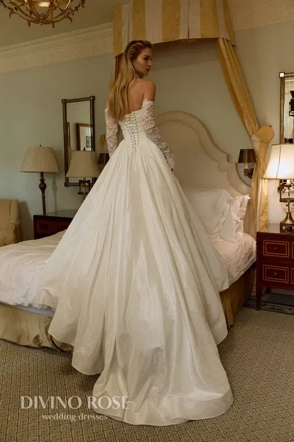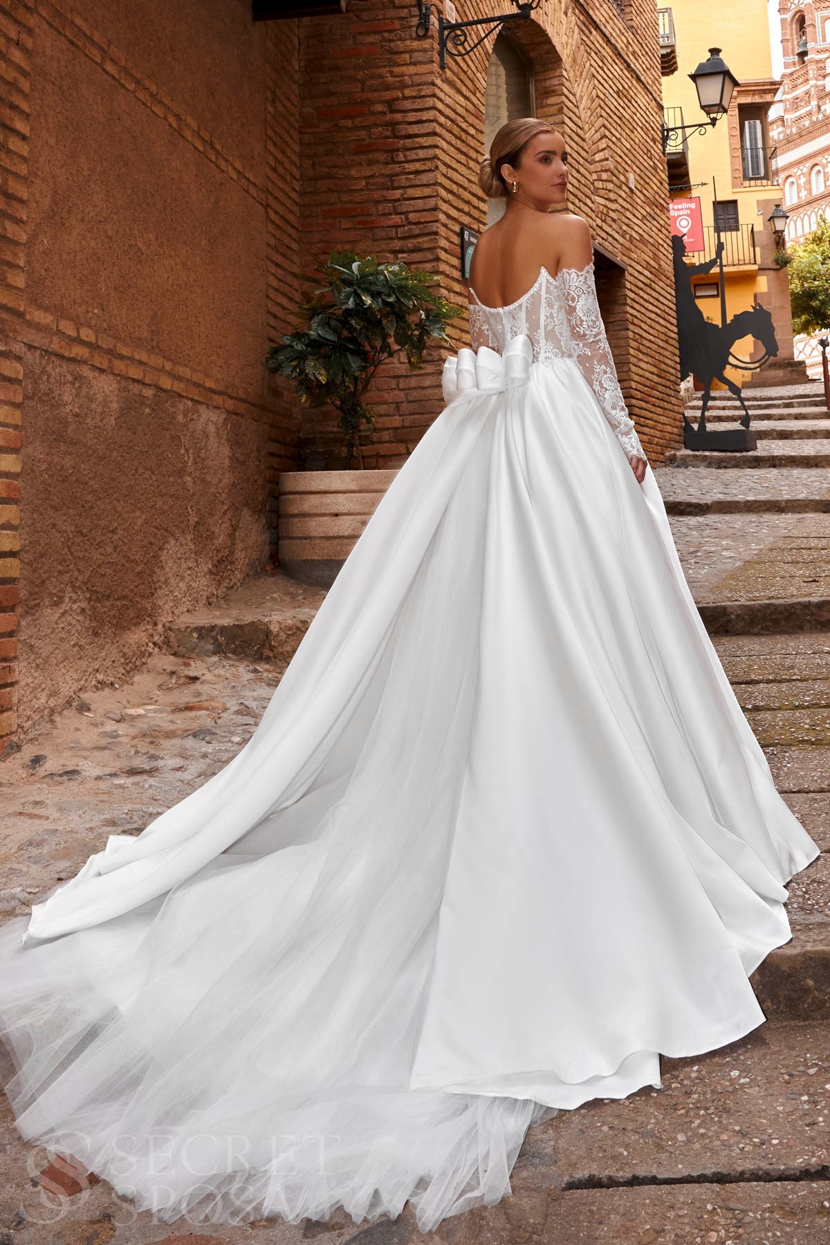 Роскошное подвенечное платье с корсетом и рукавами. Кружевной верх с V-образным вырезом и воротником-стойкой делает образ невероятно элегантным. Длинная фатиновая юбка со шлейфом для максимальной торжественности.