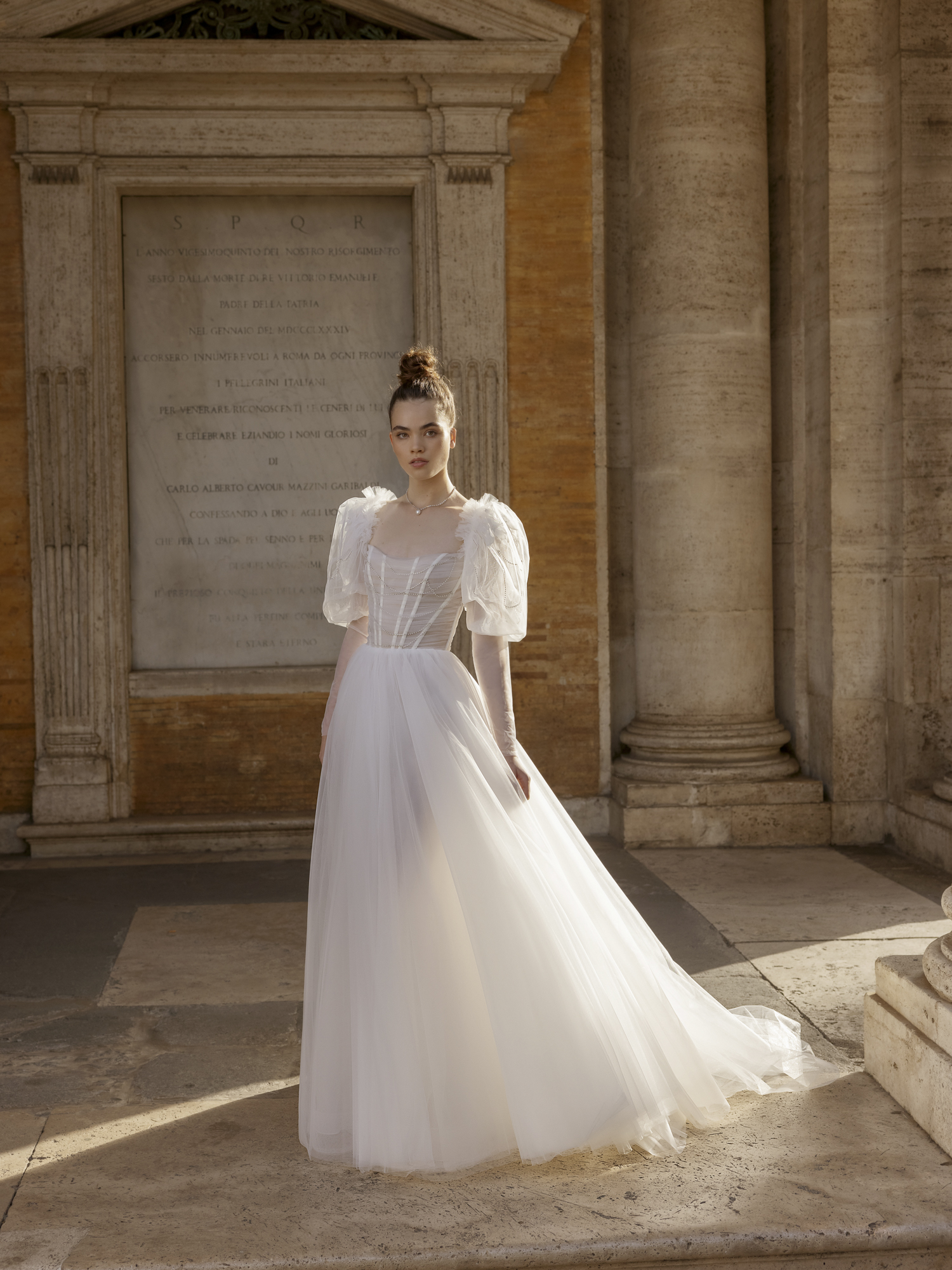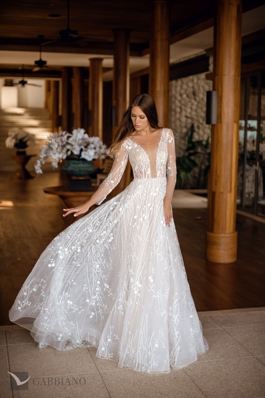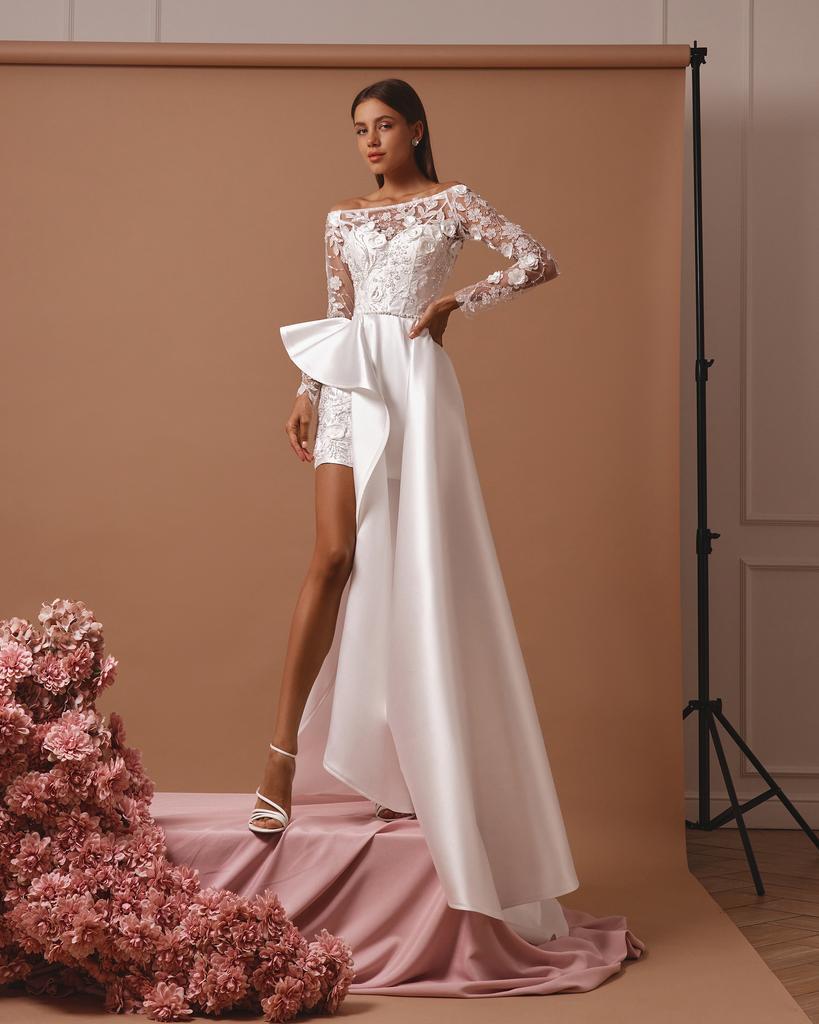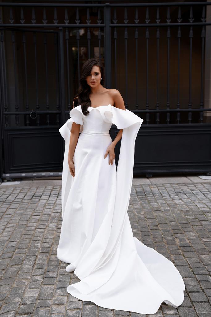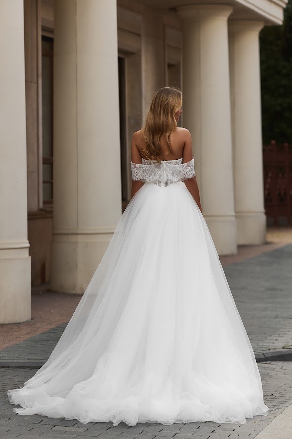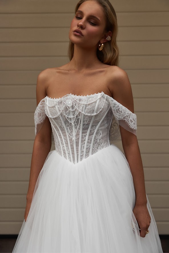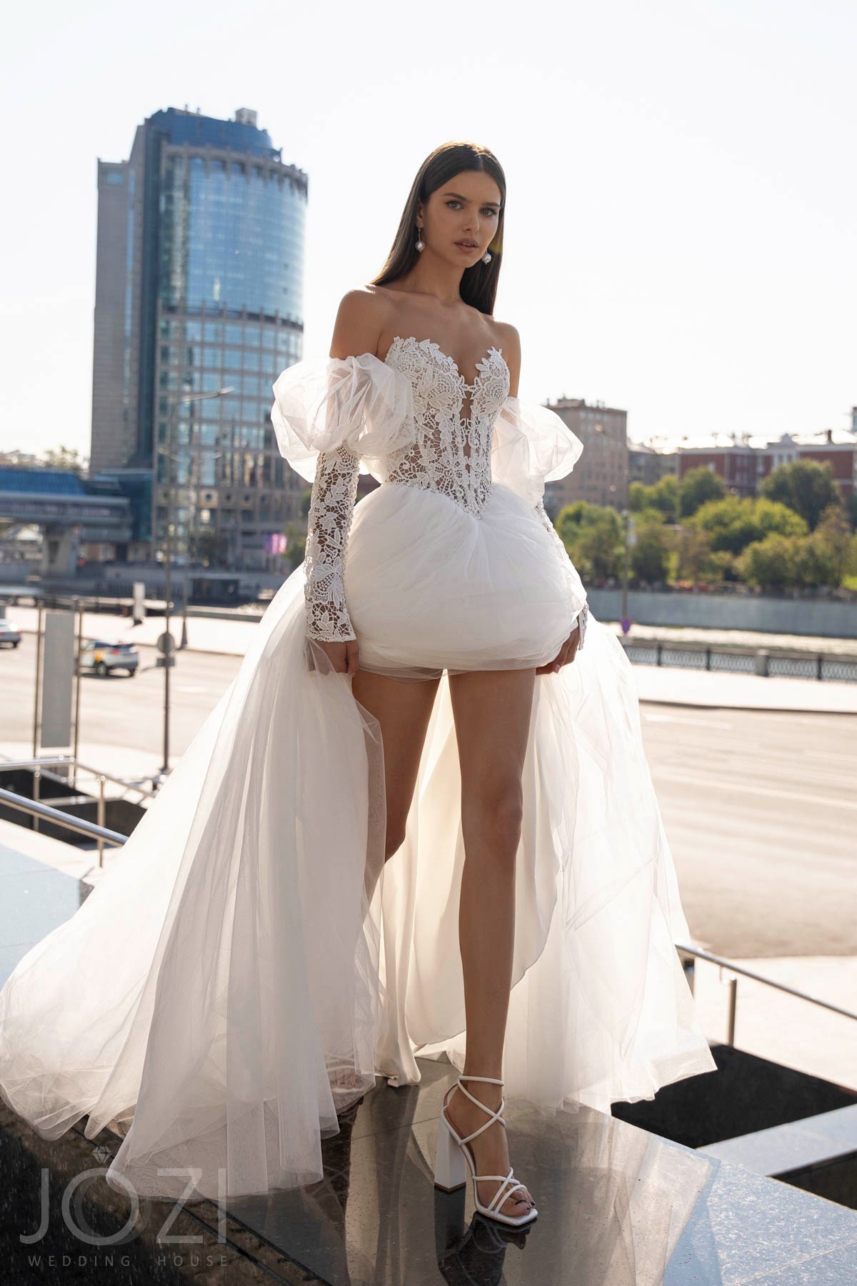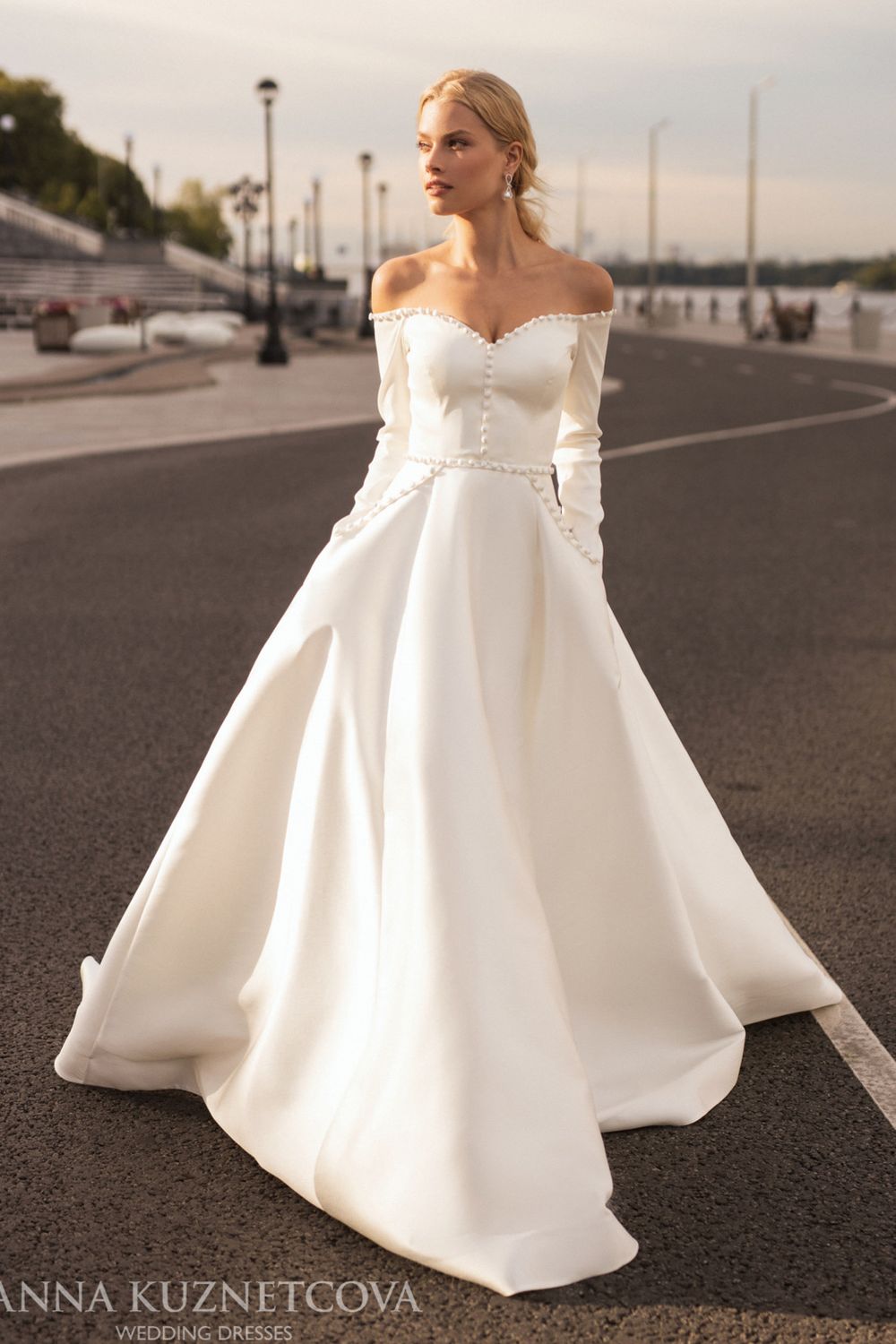 Роскошное подвенечное платье с корсетом и рукавами. Кружевной верх с V-образным вырезом и воротником-стойкой делает образ невероятно элегантным. Длинная фатиновая юбка со шлейфом для максимальной торжественности.