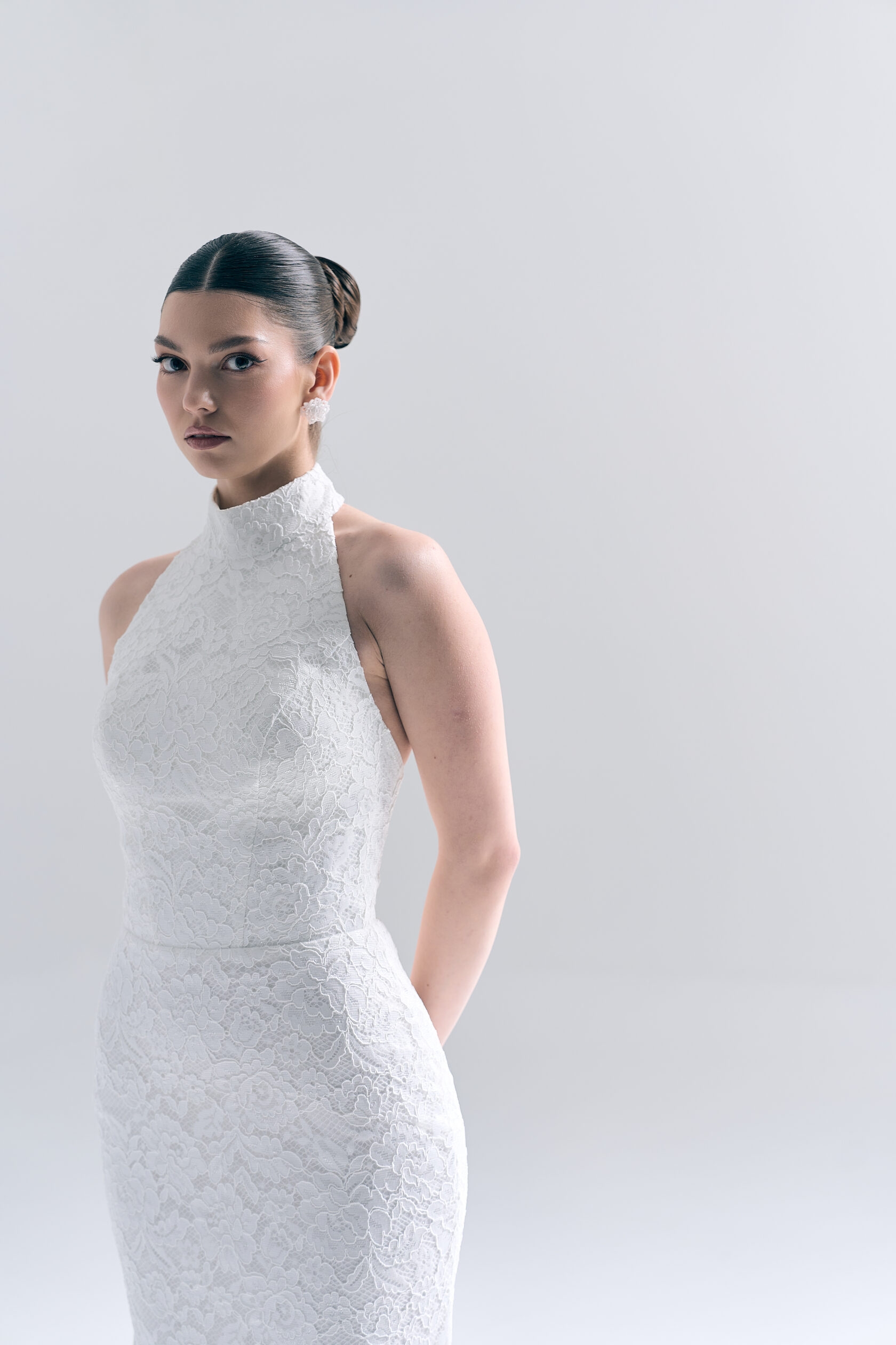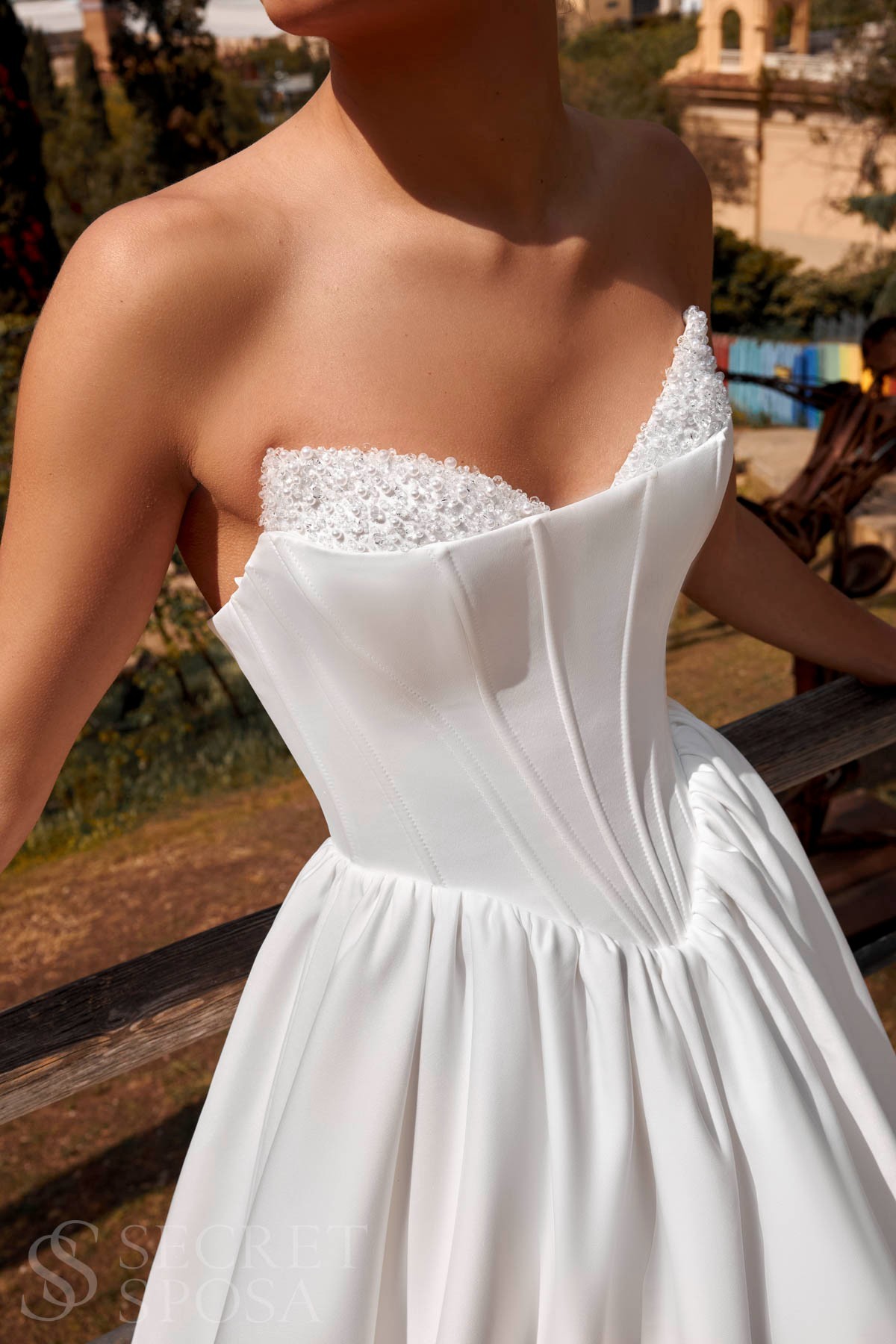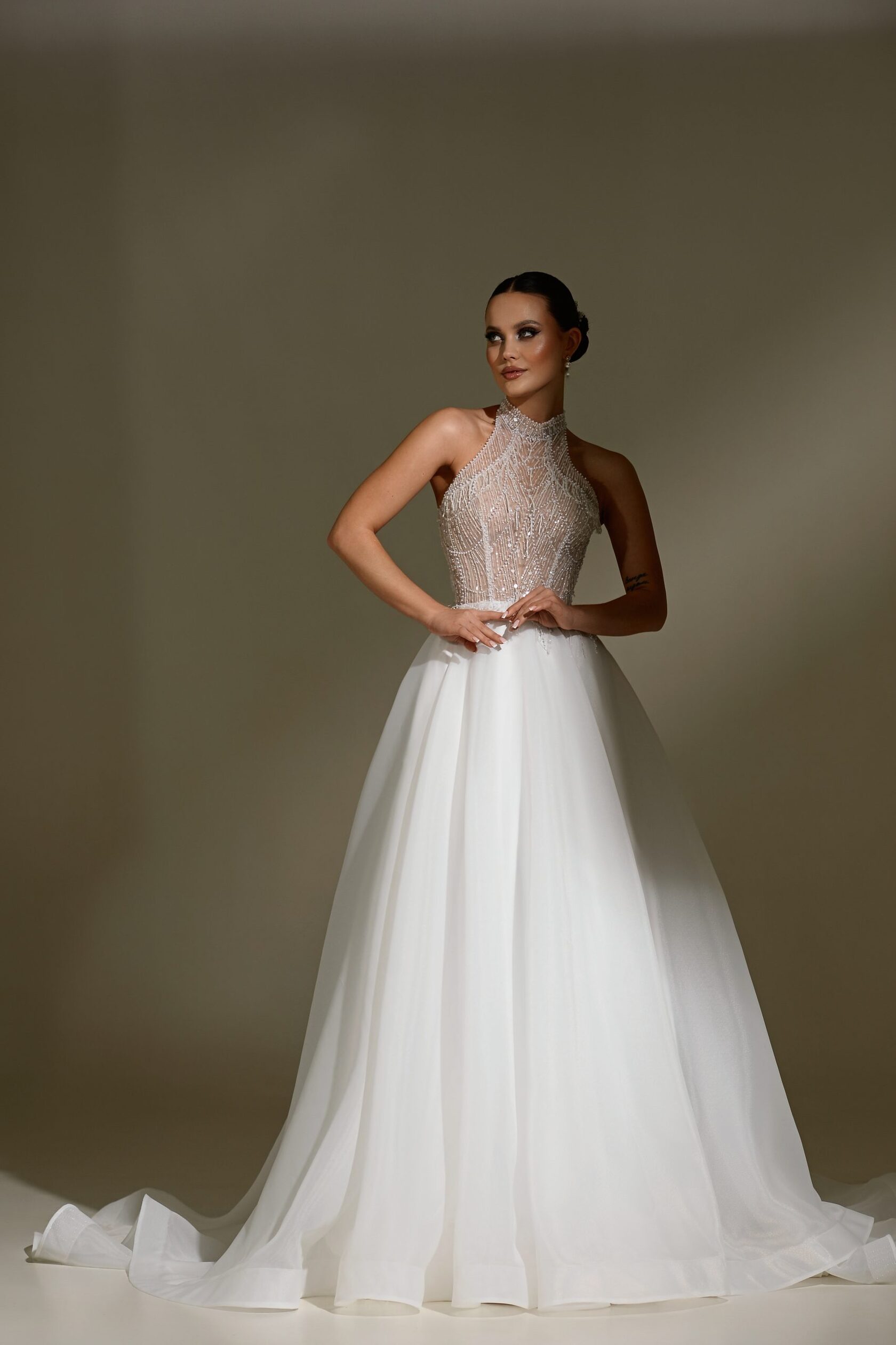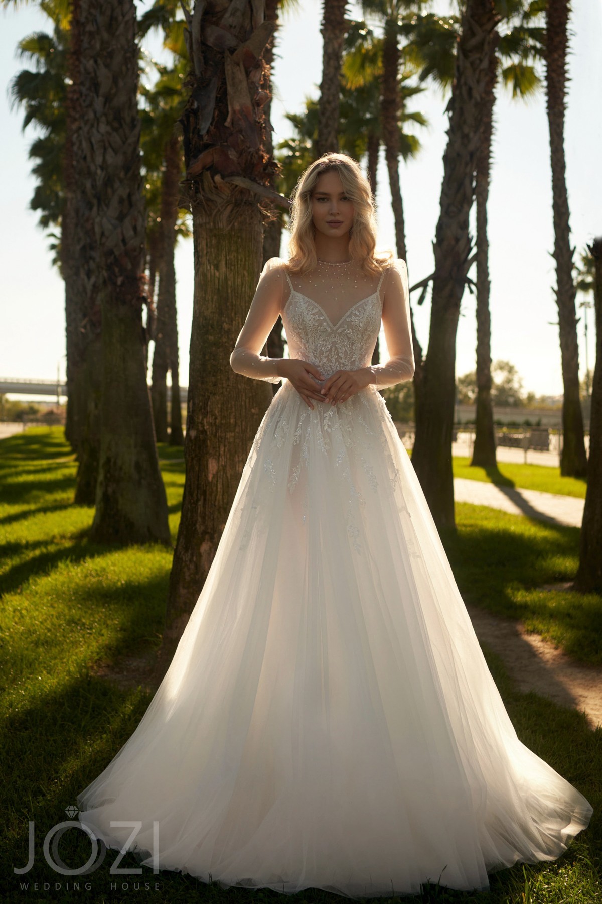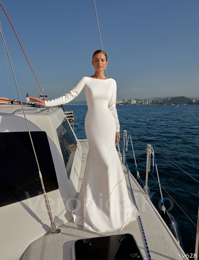 Роскошное подвенечное платье с корсетом и рукавами. Кружевной верх с V-образным вырезом и воротником-стойкой делает образ невероятно элегантным. Длинная фатиновая юбка со шлейфом для максимальной торжественности.